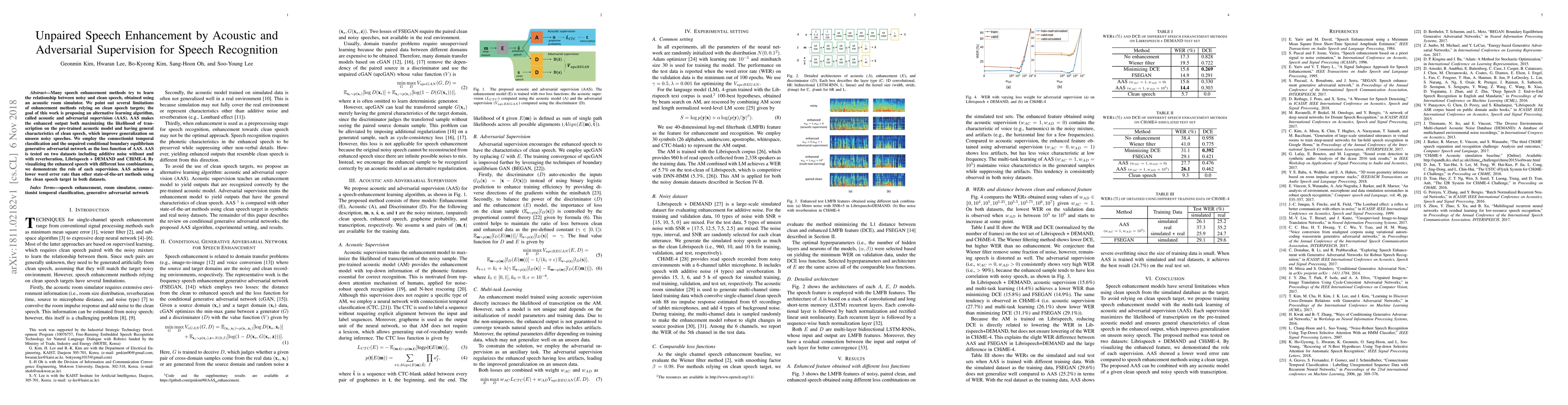 This paper proposes an alternative speech enhancement method called Acoustic and Adversarial Supervision (AAS) that enhances speech without paired clean and noisy data. AAS combines transcription likelihood and adversarial training to improve generalization, achieving lower word error rates on unseen noisy speech compared to traditional methods.