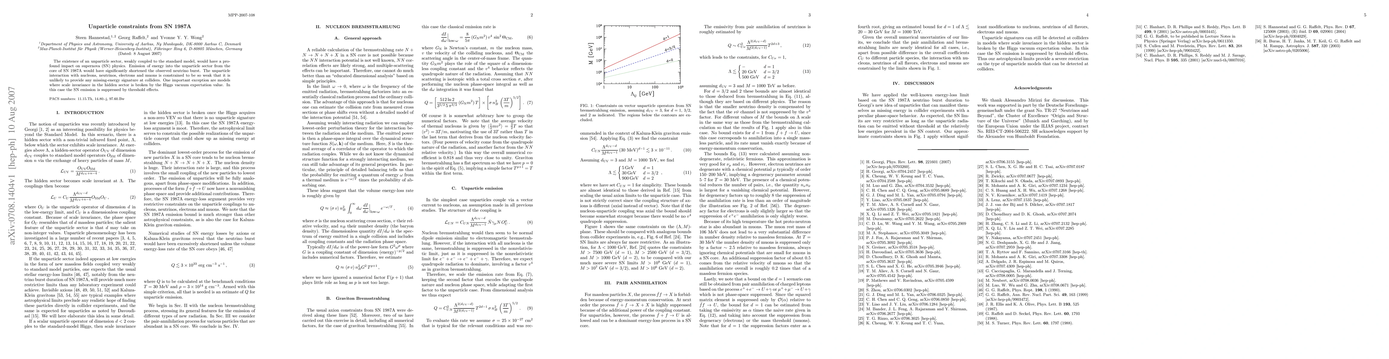 The existence of an unparticle sector, weakly coupled to the standard model, would have a profound impact on supernova (SN) physics. Emission of energy into the unparticle sector from the core of SN1987A would have significantly shortened the observed neutrino burst. The unparticle interaction with nucleons, neutrinos, electrons and muons is constrained to be so weak that it is unlikely to provide any missing-energy signature at colliders. One important exception are models where scale invariance in the hidden sector is broken by the Higgs vacuum expectation value. In this case the SN emission is suppressed by threshold effects.
