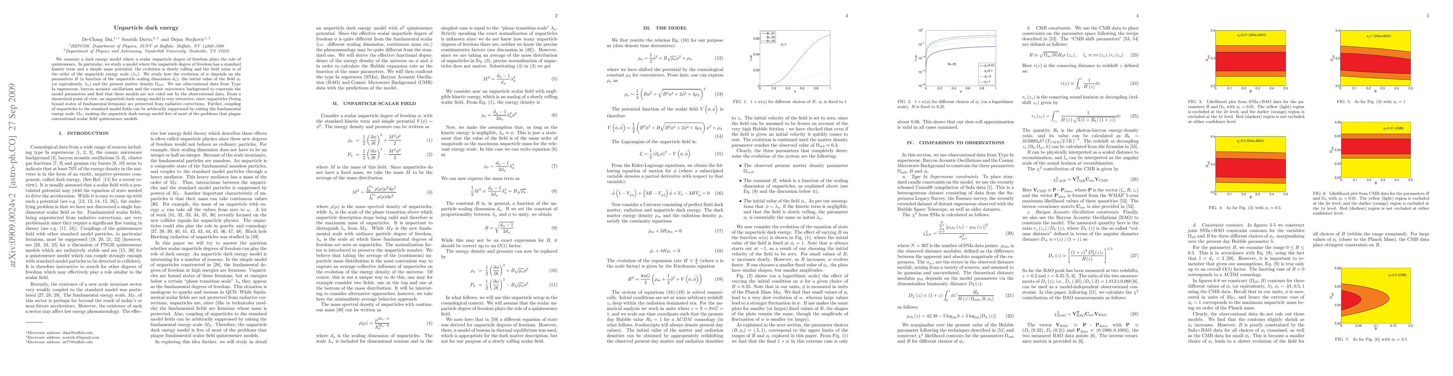 This paper explores a dark energy model where a scalar unparticle degree of freedom acts as quintessence, proposing a simple mass potential and kinetic term. It finds that the model is consistent with observational data from supernovae, BAO, and CMB, and is theoretically appealing due to unparticles' protection from radiative corrections and suppressible coupling to standard model fields.