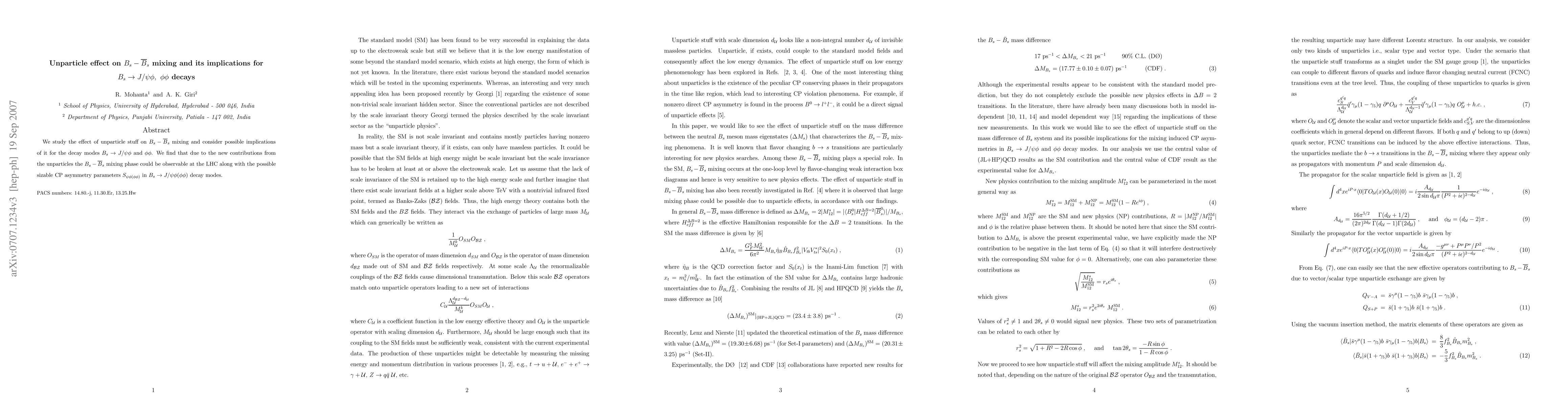 We study the effect of unparticle stuff on $B_s - \bar{B}_s$ mixing and consider possible implications of it for the decaymodes $B_s \to J/\psi \phi$ and $\phi \phi$. We find that due to the new contributions from the unparticles the $B_s - \bar{B}_s$ mixing phase could be observable at the LHC along with the possible sizable CP asymmetry parameters $S_{\psi \phi(\phi \phi)}$ in $B_s \to J/\psi \phi(\phi \phi)$ decay modes.