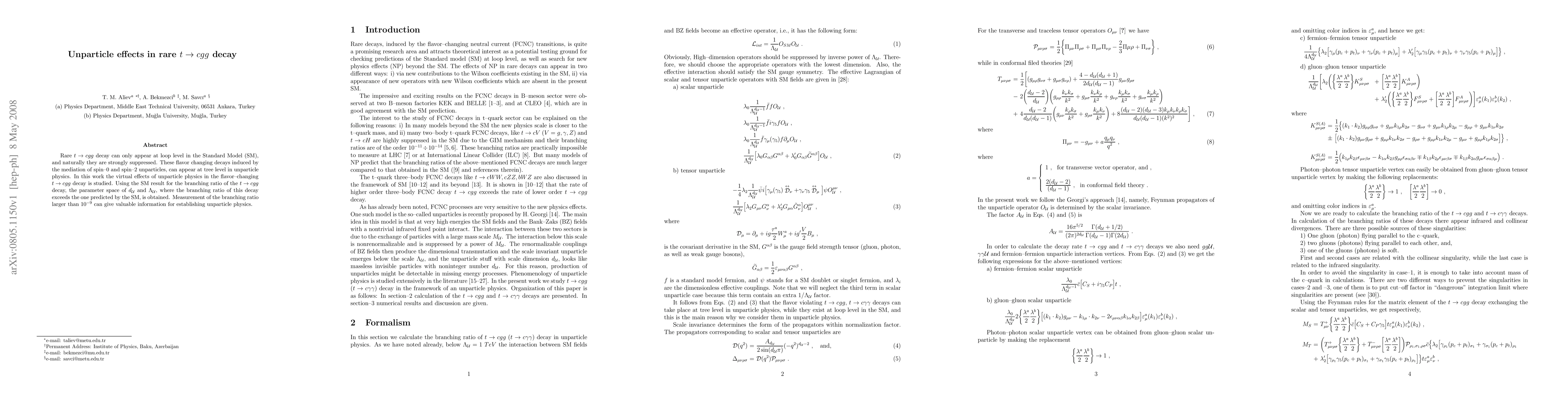 This paper investigates the potential impact of unparticle physics on the rare decay (t -> c g g), which is typically suppressed in the Standard Model. It explores the parameter space where unparticle effects could enhance the decay rate beyond the SM prediction, emphasizing the significance of measuring a branching ratio exceeding 10^(-9) for validating unparticle theories.