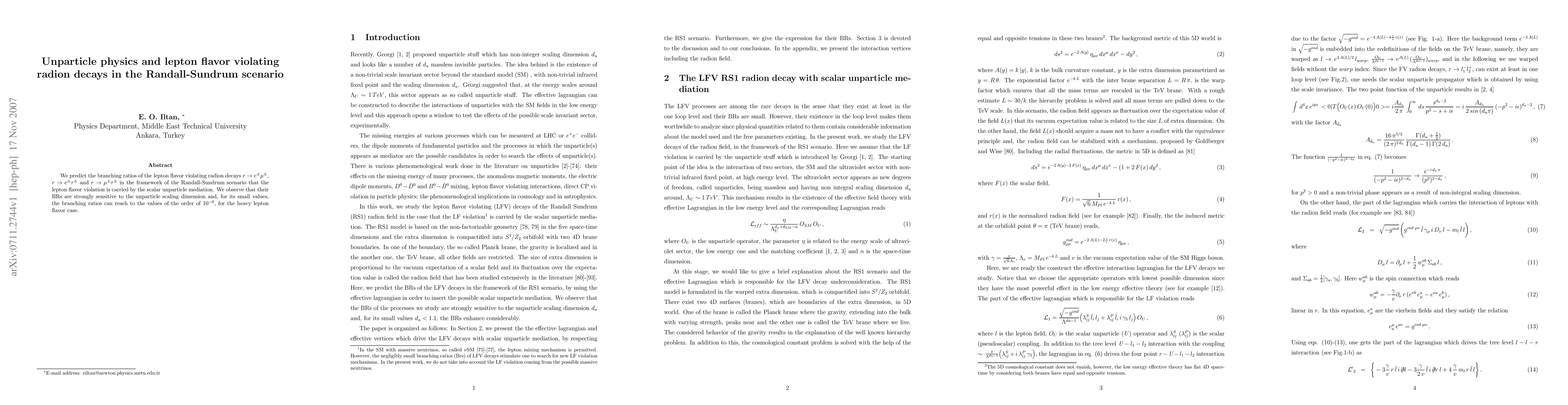 This paper explores the branching ratios of lepton flavor violating radion decays in the Randall-Sundrum model, mediated by scalar unparticles. It finds that the branching ratios are significantly influenced by the unparticle scaling dimension, potentially reaching values of around 10^-8 for decays involving heavy leptons.