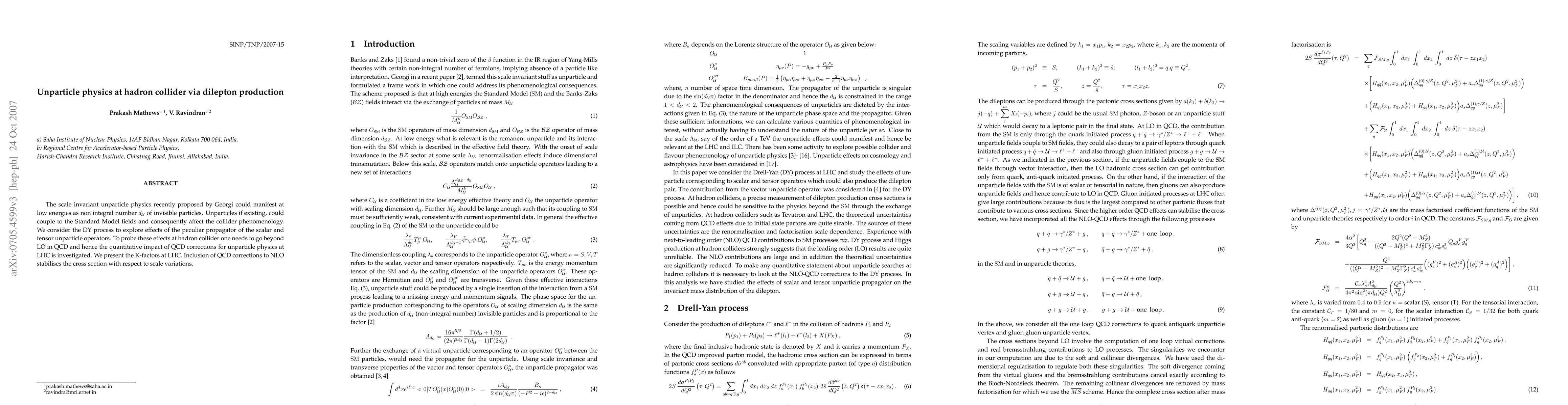 This paper investigates the potential manifestation of unparticle physics at hadron colliders through dilepton production in the DY process, considering the effects of scalar and tensor unparticle operators. The study includes next-to-leading order (NLO) QCD corrections to stabilize cross-section results, providing K-factors for unparticle physics at the LHC.