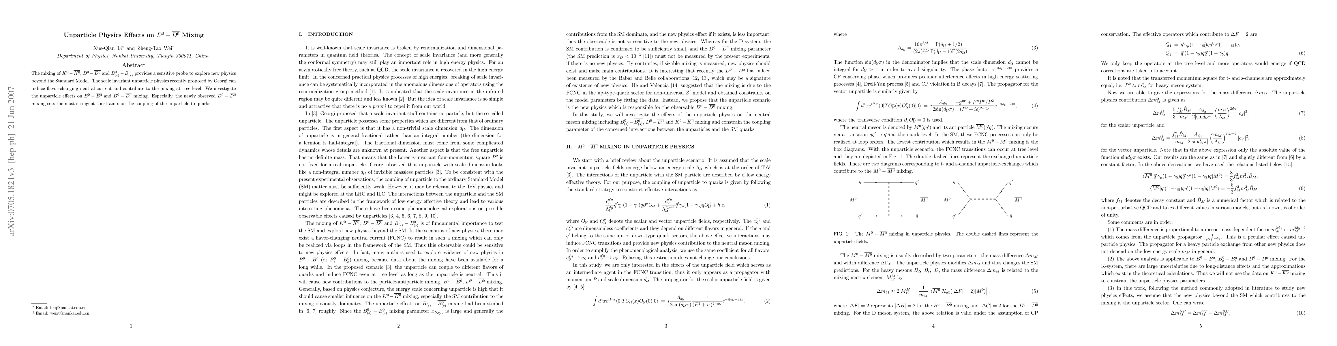 This paper explores how unparticle physics, a proposed scale-invariant phenomenon, can influence $D^0-\bar{D^0}$ and $B^0-\bar{B^0}$ mixing, providing a new probe for physics beyond the Standard Model. The study finds that unparticle effects can contribute to mixing at tree level, with the newly observed $D^0-\bar{D^0}$ mixing imposing the most stringent constraints on unparticle-quark coupling.