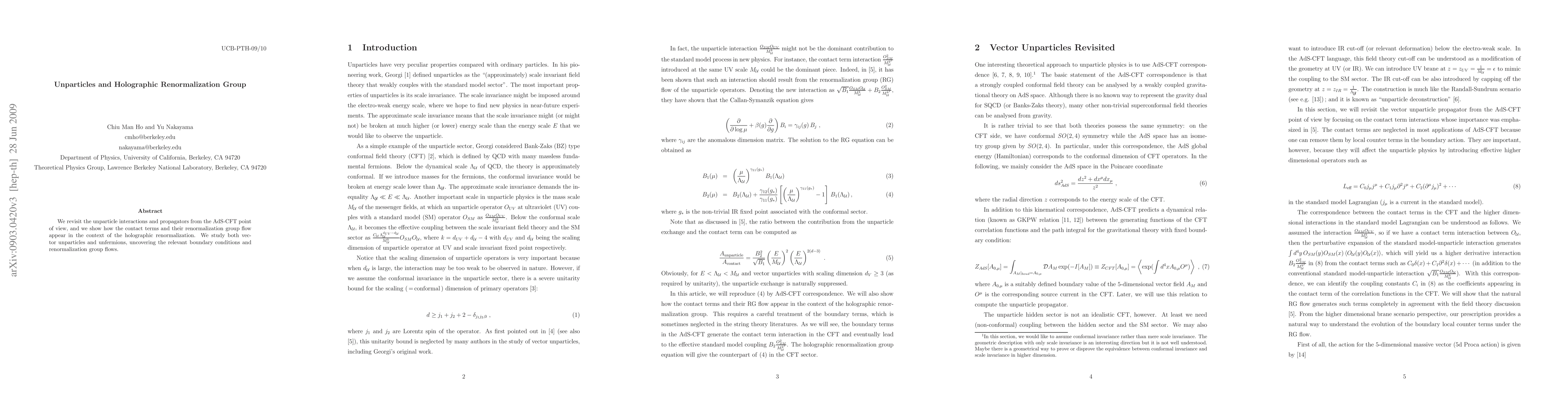 This paper explores unparticle interactions and propagators through the AdS-CFT framework, demonstrating the emergence of contact terms and their renormalization group flows within holographic renormalization. It investigates both vector unparticles and unfermions, identifying essential boundary conditions and RG flows.