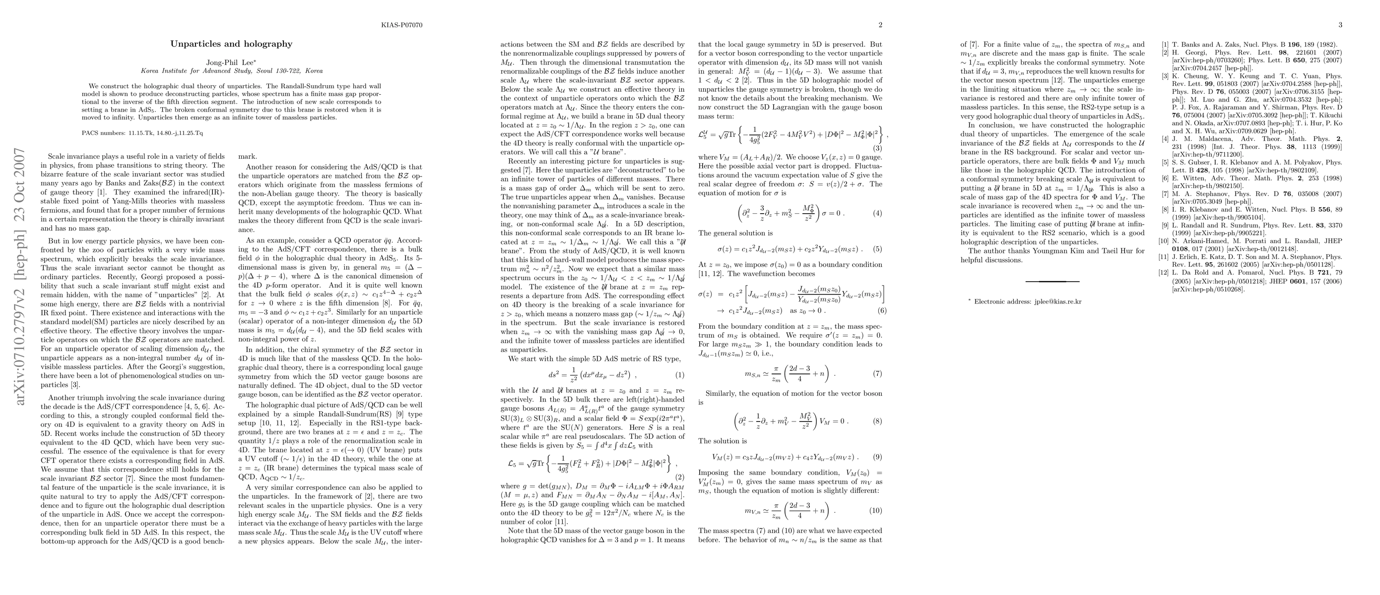 We construct the holographic dual theory of unparticles. The Randall-Sundrum type hard wall model is shown to produce deconstructing particles, whose spectrum has a finite mass gap proportional to the inverse of the fifth direction segment. The introduction of new scale corresponds to setting a brane in ${\rm AdS}_5$. The broken conformal symmetry due to this brane is restored when it is moved to infinity. Unparticles then emerge as an infinite tower of massless particles.