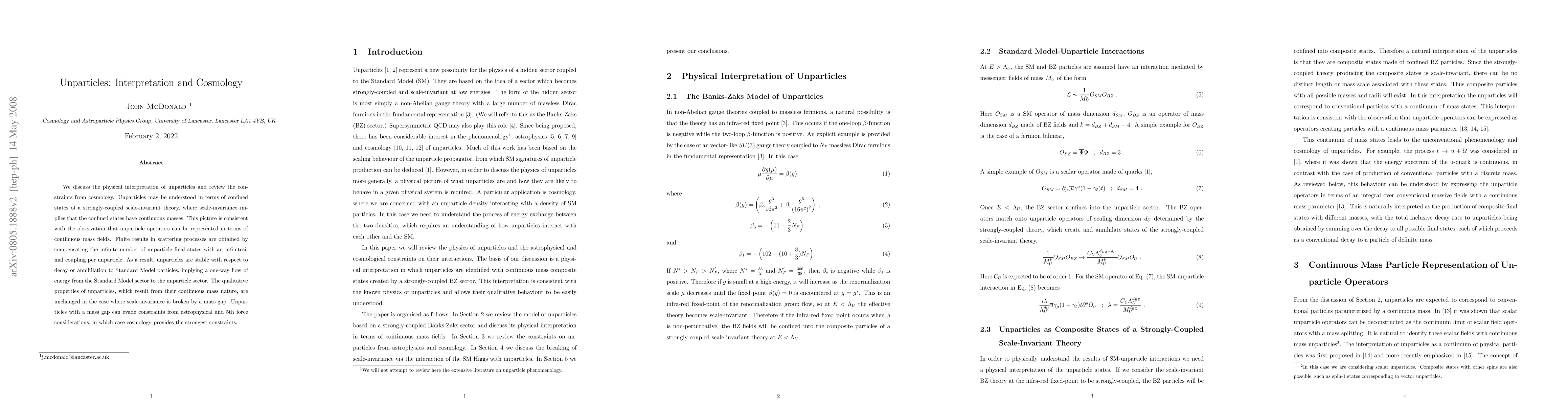 We discuss the physical interpretation of unparticles and review the constraints from cosmology. Unparticles may be understood in terms of confined states of a strongly-coupled scale-invariant theory, where scale-invariance implies that the confined states have continuous masses. This picture is consistent with the observation that unparticle operators can be represented in terms of continuous mass fields. Finite results in scattering processes are obtained by compensating the infinite number of unparticle final states with an infinitesimal coupling per unparticle. As a result, unparticles are stable with respect to decay or annihilation to Standard Model particles, implying a one-way flow of energy from the Standard Model sector to the unparticle sector. The qualitative properties of unparticles, which result from their continuous mass nature, are unchanged in the case where scale-invariance is broken by a mass gap. Unparticles with a mass gap can evade constraints from astrophysical and 5th force considerations, in which case cosmology provides the strongest constraints.