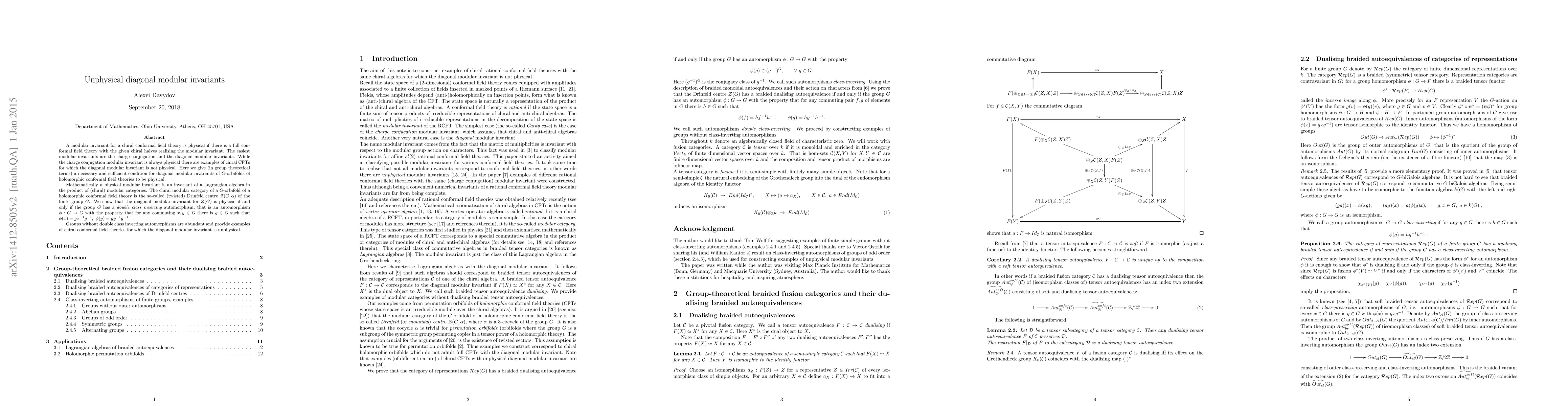 This paper investigates the physical nature of diagonal modular invariants in chiral conformal field theories (CFTs), particularly for $G$-orbifolds of holomorphic CFTs. It concludes that a diagonal modular invariant is physical if and only if the group $G$ possesses a "double class inverting" automorphism, a specific type of group automorphism that inverts commuting elements in particular ways. Groups lacking such automorphisms yield unphysical diagonal modular invariants.