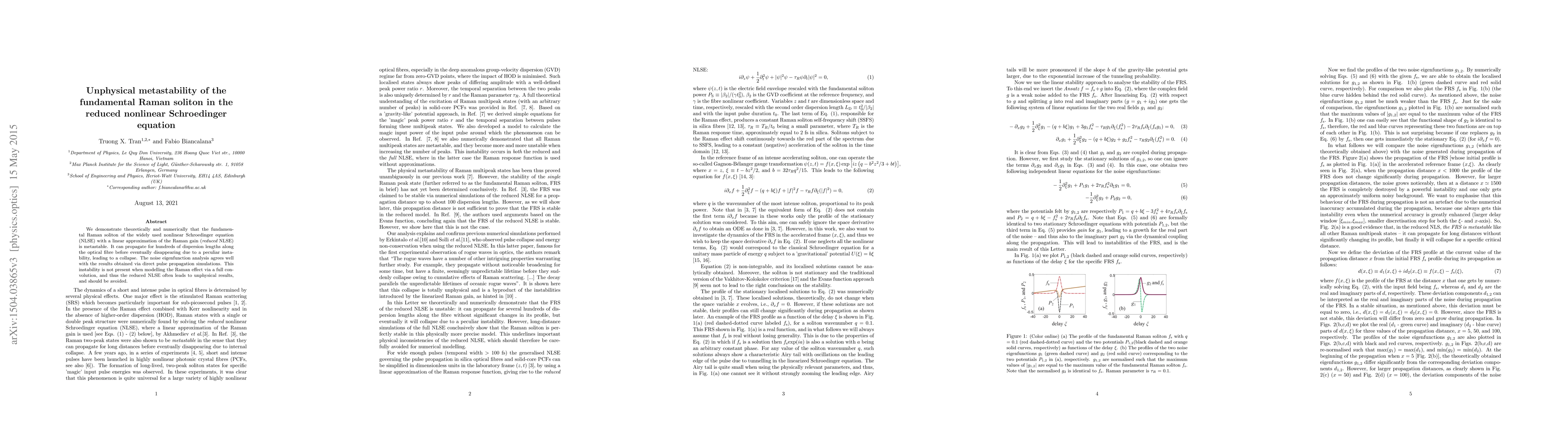 The paper demonstrates that the fundamental Raman soliton in the reduced nonlinear Schrödinger equation is metastable, propagating before collapsing due to an instability. This instability is absent in the full convolution model, indicating the reduced NLSE often yields unphysical results.