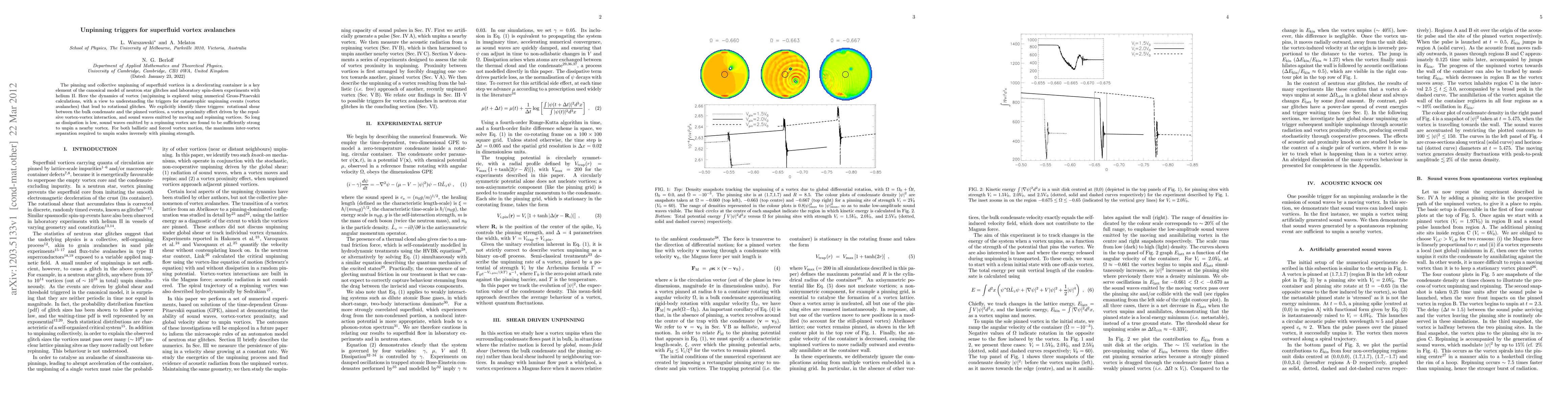 The pinning and collective unpinning of superfluid vortices in a decelerating container is a key element of the canonical model of neutron star glitches and laboratory spin-down experiments with helium II. Here the dynamics of vortex (un)pinning is explored using numerical Gross-Pitaevskii calculations, with a view to understanding the triggers for catastrophic unpinning events (vortex avalanches) that lead to rotational glitches. We explicitly identify three triggers: rotational shear between the bulk condensate and the pinned vortices, a vortex proximity effect driven by the repulsive vortex-vortex interaction, and sound waves emitted by moving and repinning vortices. So long as dissipation is low, sound waves emitted by a repinning vortex are found to be sufficiently strong to unpin a nearby vortex. For both ballistic and forced vortex motion, the maximum inter-vortex separation required to unpin scales inversely with pinning strength.