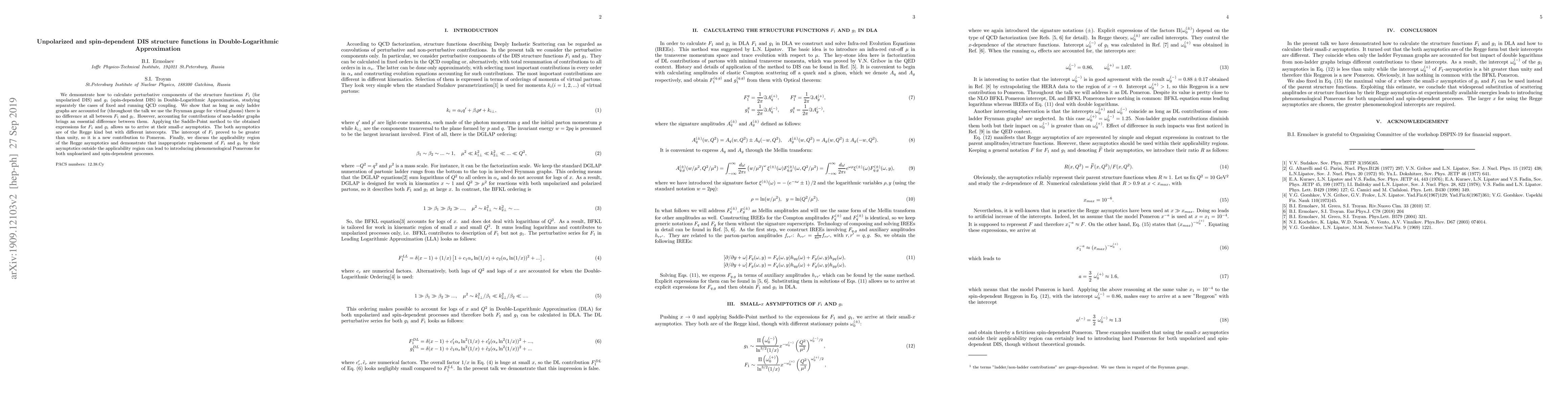 This paper calculates perturbative components of unpolarized and spin-dependent DIS structure functions in Double-Logarithmic Approximation, revealing that while ladder graphs treat F_1 and g_1 similarly, non-ladder graphs differentiate them. The study finds F_1's intercept greater than unity, contributing to the Pomeron, and warns against misapplying Regge asymptotics.