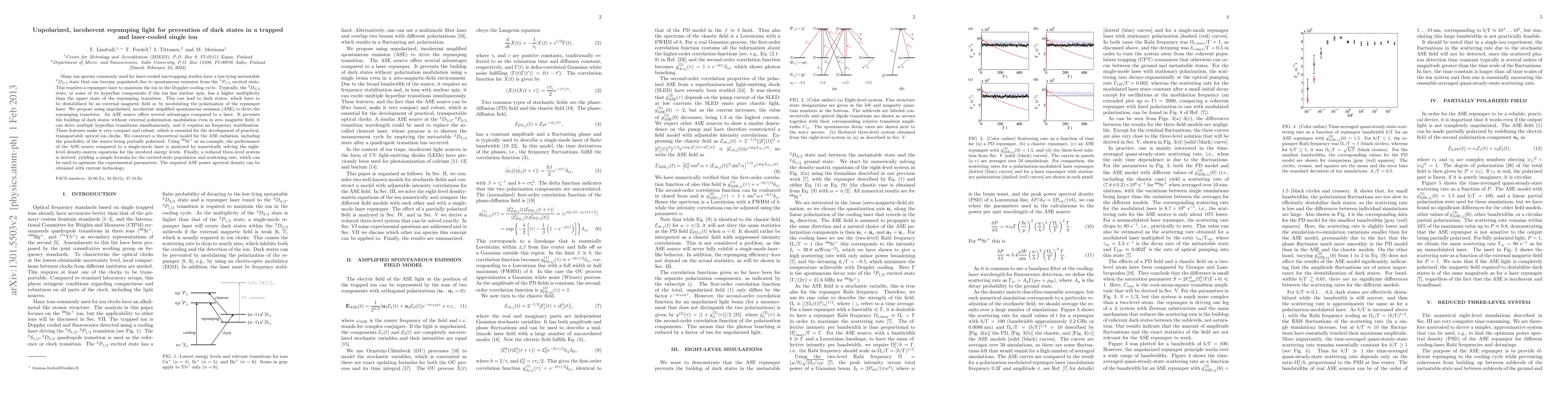 This paper proposes using unpolarized, incoherent amplified spontaneous emission (ASE) for repumping in laser-cooled ion traps to prevent dark states without external magnetic fields or polarization modulation. ASE is shown to be compact, robust, and effective compared to laser repumpers, demonstrated through theoretical modeling and numerical analysis of 88Sr+ ion energy levels.