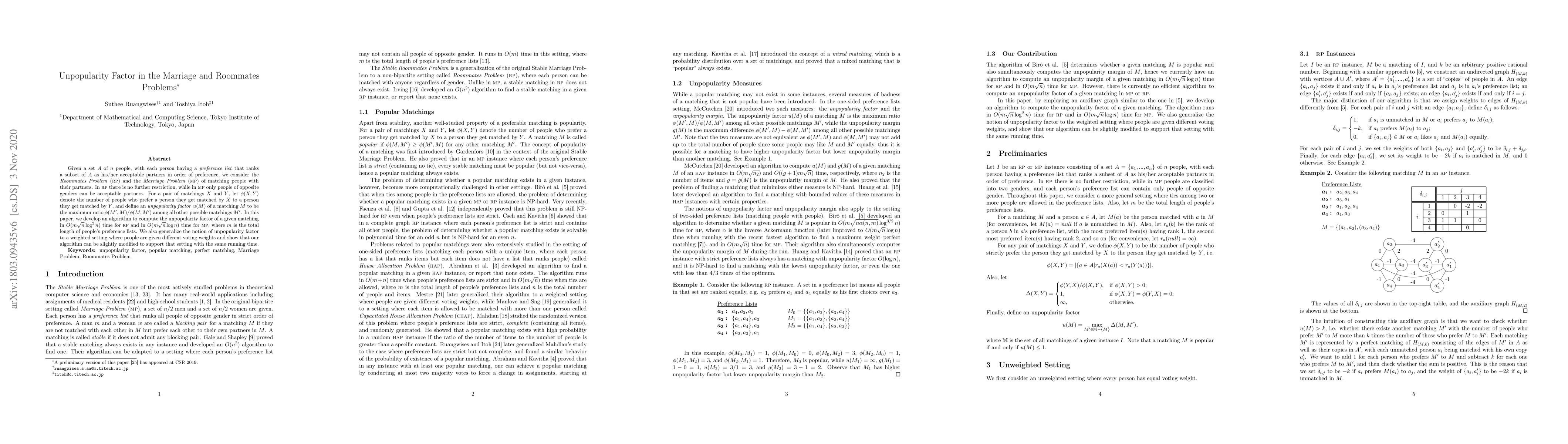 Given a set $A$ of $n$ people, with each person having a preference list that ranks a subset of $A$ as his/her acceptable partners in order of preference, we consider the Roommates Problem (RP) and the Marriage Problem (MP) of matching people with their partners. In RP there is no further restriction, while in MP only people of opposite genders can be acceptable partners. For a pair of matchings $X$ and $Y$, let $\phi(X,Y)$ denote the number of people who prefer a person they get matched by $X$ to a person they get matched by $Y$, and define an unpopularity factor $u(M)$ of a matching $M$ to be the maximum ratio $\phi(M',M) / \phi(M,M')$ among all other possible matchings $M'$. In this paper, we develop an algorithm to compute the unpopularity factor of a given matching in $O(m\sqrt{n}\log^2 n)$ time for RP and in $O(m\sqrt{n}\log n)$ time for MP, where $m$ is the total length of people's preference lists. We also generalize the notion of unpopularity factor to a weighted setting where people are given different voting weights and show that our algorithm can be slightly modified to support that setting with the same running time.