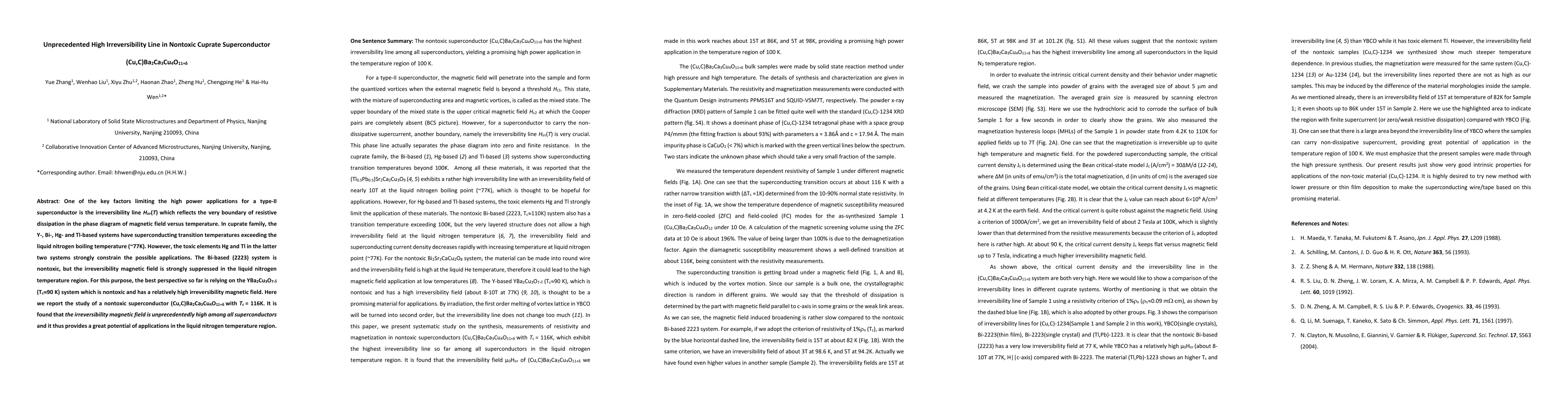 Researchers discovered a nontoxic superconductor with an unprecedentedly high irreversibility magnetic field, offering great potential for applications in liquid nitrogen temperature regions.