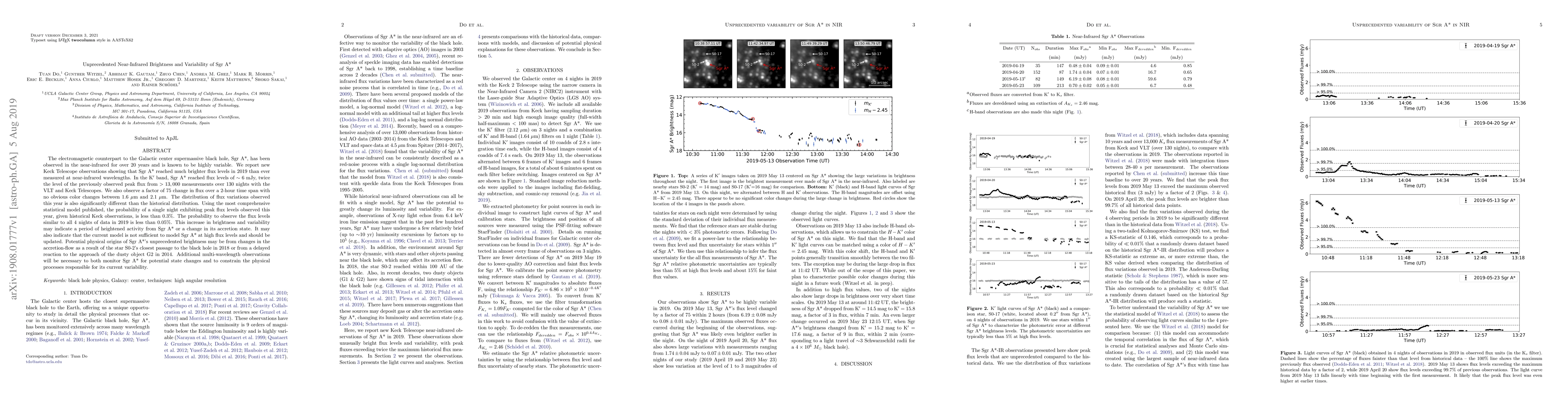 The Galactic center's supermassive black hole, Sgr A*, exhibited unprecedented brightness and variability in near-infrared observations in 2019, reaching flux levels twice the previous peak and showing significant flux changes within hours. This suggests a potential period of heightened activity or a need for updated models to account for such extreme variability.