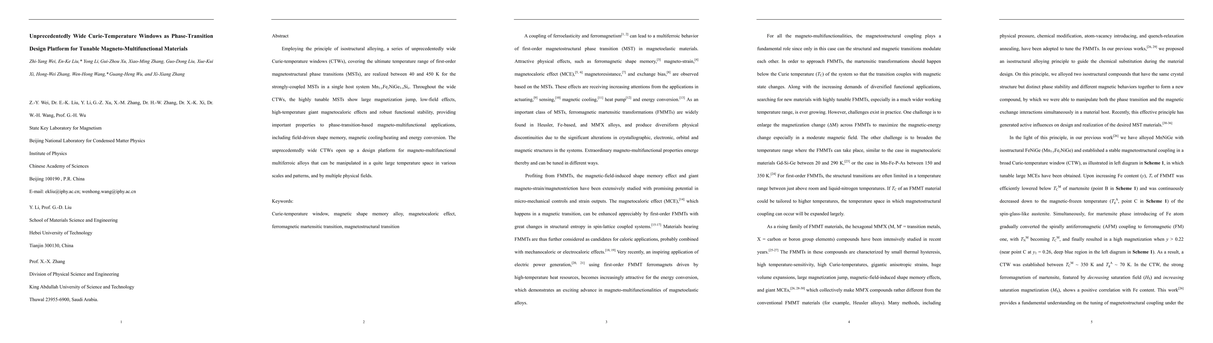 A series of unprecedentedly wide Curie-temperature windows (CTWs) between 40 and 450 K are realized by employing the isostructural alloying principle for the strongly coupled magnetostructural phase transitions in a single host system. The CTWs provide a design platform for magneto-multifunctional multiferroic alloys that can be manipulated in a quite large temperature space in various scales and patterns, as well as by multiple physical fields.