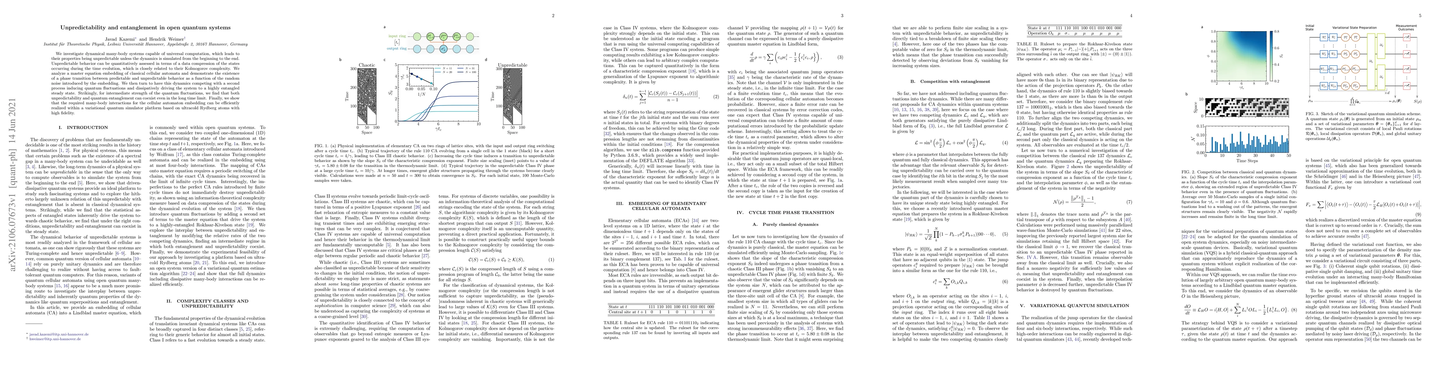 We investigate dynamical many-body systems capable of universal computation, which leads to their properties being unpredictable unless the dynamics is simulated from the beginning to the end. Unpredictable behavior can be quantitatively assessed in terms of a data compression of the states occurring during the time evolution, which is closely related to their Kolmogorov complexity. We analyze a master equation embedding of classical cellular automata and demonstrate the existence of a phase transition between predictable and unpredictable behavior as a function of the random noise introduced by the embedding. We then turn to have this dynamics competing with a second process inducing quantum fluctuations and dissipatively driving the system to a highly entangled steady state. Strikingly, for intermediate strength of the quantum fluctuations, we find that both unpredictability and quantum entanglement can coexist even in the long time limit. Finally, we show that the required many-body interactions for the cellular automaton embedding can be efficiently realized within a variational quantum simulator platform based on ultracold Rydberg atoms with high fidelity.