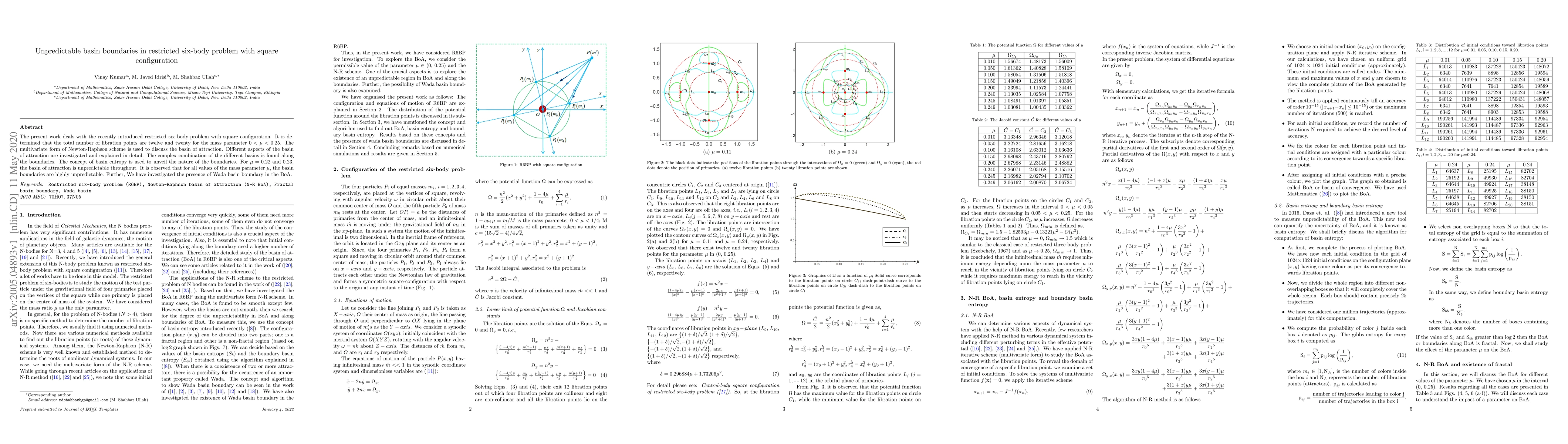 This paper investigates the restricted six-body problem with a square configuration, identifying twelve and twenty libration points for $0 < \mu < 0.25$. It finds unpredictable basin boundaries and complex basin entropy, especially for $\mu = 0.22$ and $0.23$, revealing the presence of Wada basin boundaries.