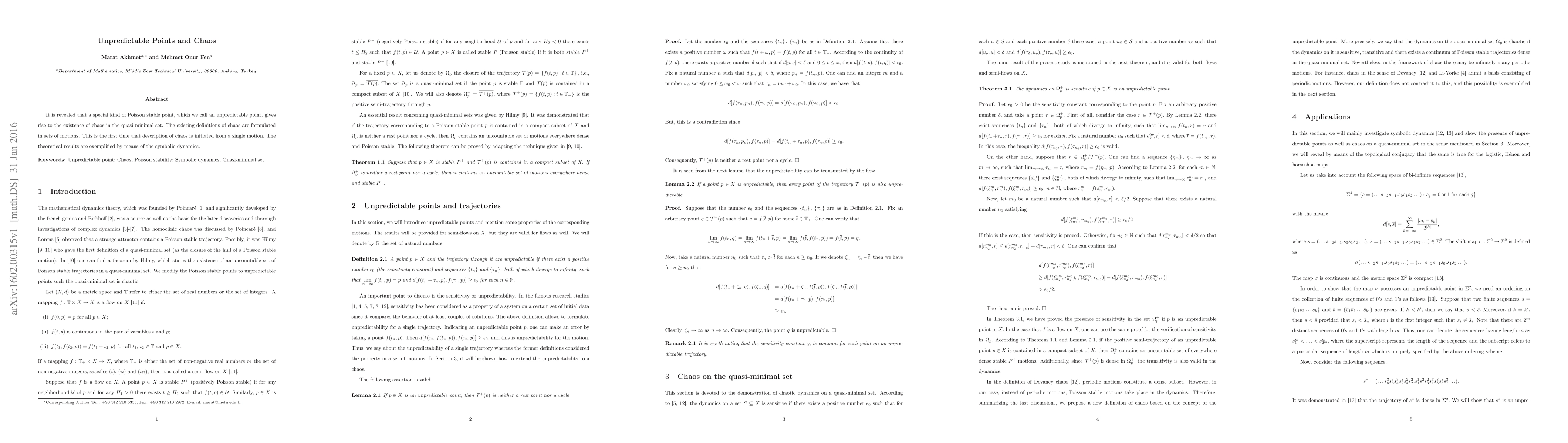 This paper introduces "unpredictable points" as a novel kind of Poisson stable point that leads to chaos within quasi-minimal sets, marking a shift from set-based to motion-based chaos definitions. The findings are demonstrated through symbolic dynamics.