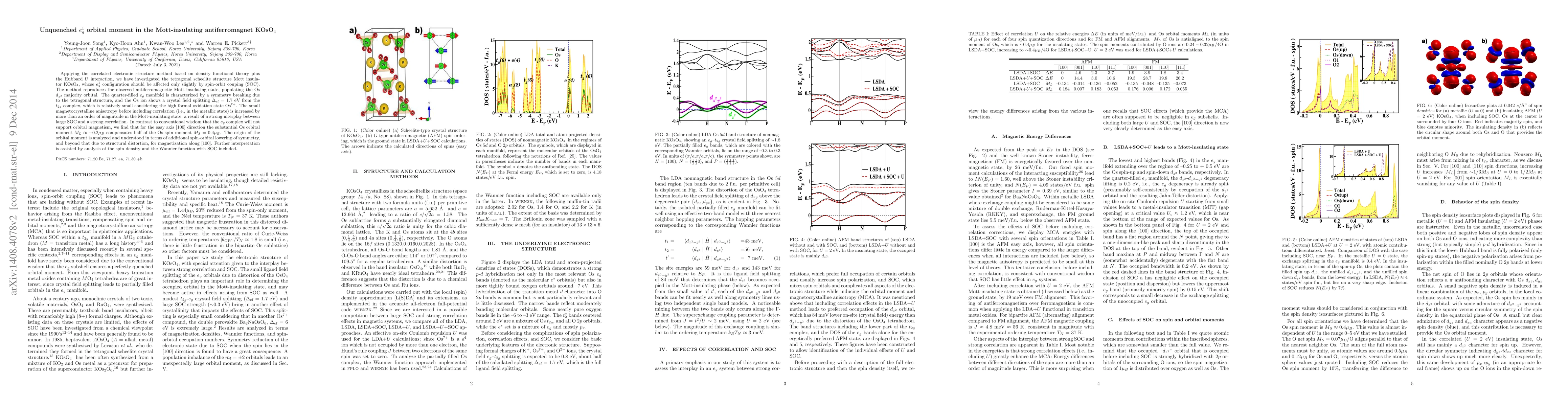 Applying the correlated electronic structure method based on density functional theory plus the Hubbard $U$ interaction, we have investigated the tetragonal scheelite structure Mott insulator KOsO$_4$, whose $e_g^1$ configuration should be affected only slightly by spin-orbit couping (SOC). The method reproduces the observed antiferromagnetic Mott insulating state, populating the Os $d_{z^2}$ majority orbital. The quarter-filled $e_g$ manifold is characterized by a symmetry breaking due to the tetragonal structure, and the Os ion shows a crystal field splitting $\Delta_{cf}$ = 1.7 eV from the $t_{2g}$ complex, which is relatively small considering the high formal oxidation state Os$^{7+}$. The small magnetocrystalline anisotropy before including correlation (i.e., in the metallic state) is increased by more than an order of magnitude in the Mott-insulating state, a result of a strong interplay between large SOC and a strong correlation. In contrast to conventional wisdom that the $e_g$ complex will not support orbital magnetism, we find that for the easy axis [100] direction the substantial Os orbital moment $M_L\approx-0.2 \mu_B$ compensates half of the Os spin moment $M_S$ = 0.4$\mu_B$. The origin of the orbital moment is analyzed and understood in terms of additional spin-orbital lowering of symmetry, and beyond that due to structural distortion, for magnetization along [100]. Further interpretation is assisted by analysis of the spin density and the Wannier function with SOC included.