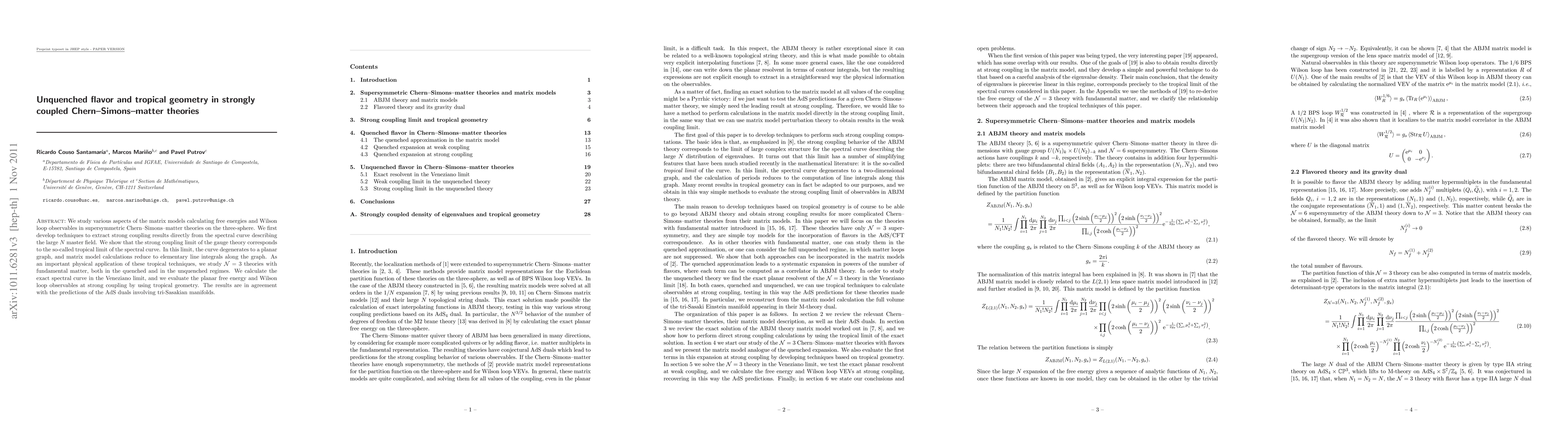 We study various aspects of the matrix models calculating free energies and Wilson loop observables in supersymmetric Chern-Simons-matter theories on the three-sphere. We first develop techniques to extract strong coupling results directly from the spectral curve describing the large N master field. We show that the strong coupling limit of the gauge theory corresponds to the so-called tropical limit of the spectral curve. In this limit, the curve degenerates to a planar graph, and matrix model calculations reduce to elementary line integrals along the graph. As an important physical application of these tropical techniques, we study N=3 theories with fundamental matter, both in the quenched and in the unquenched regimes. We calculate the exact spectral curve in the Veneziano limit, and we evaluate the planar free energy and Wilson loop observables at strong coupling by using tropical geometry. The results are in agreement with the predictions of the AdS duals involving tri-Sasakian manifolds