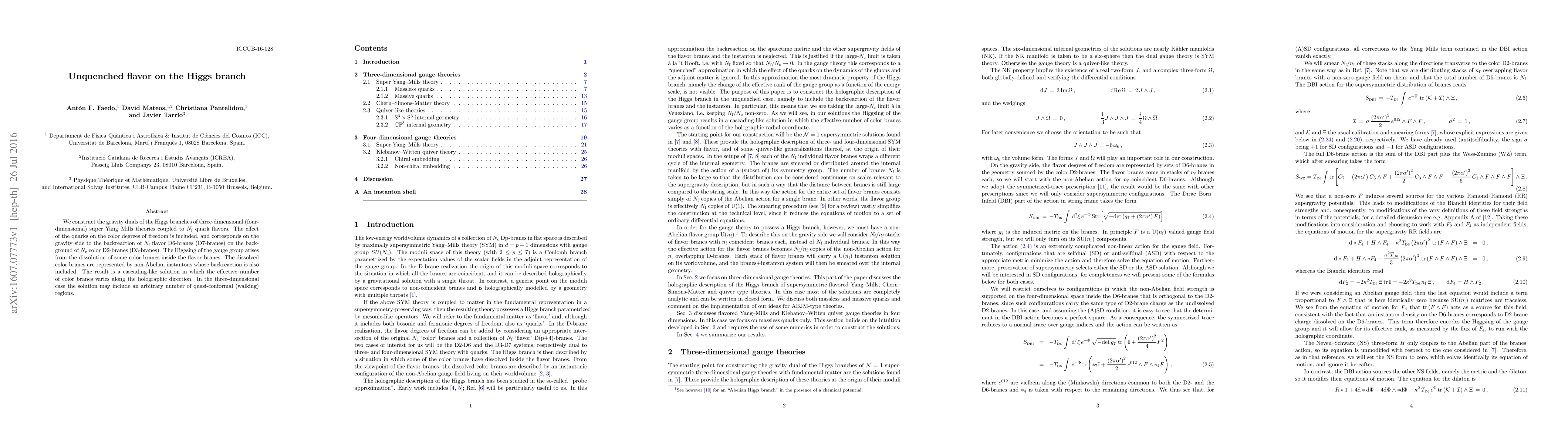 We construct the gravity duals of the Higgs branches of three-dimensional (four-dimensional) super Yang-Mills theories coupled to $N_\textrm{f}$ quark flavors. The effect of the quarks on the color degrees of freedom is included, and corresponds on the gravity side to the backreaction of $N_\textrm{f}$ flavor D6-branes (D7-branes) on the background of $N_\textrm{c}$ color D2-branes (D3-branes). The Higgsing of the gauge group arises from the dissolution of some color branes inside the flavor branes. The dissolved color branes are represented by non-Abelian instantons whose backreaction is also included. The result is a cascading-like solution in which the effective number of color branes varies along the holographic direction. In the three-dimensional case the solution may include an arbitrary number of quasi-conformal (walking) regions.