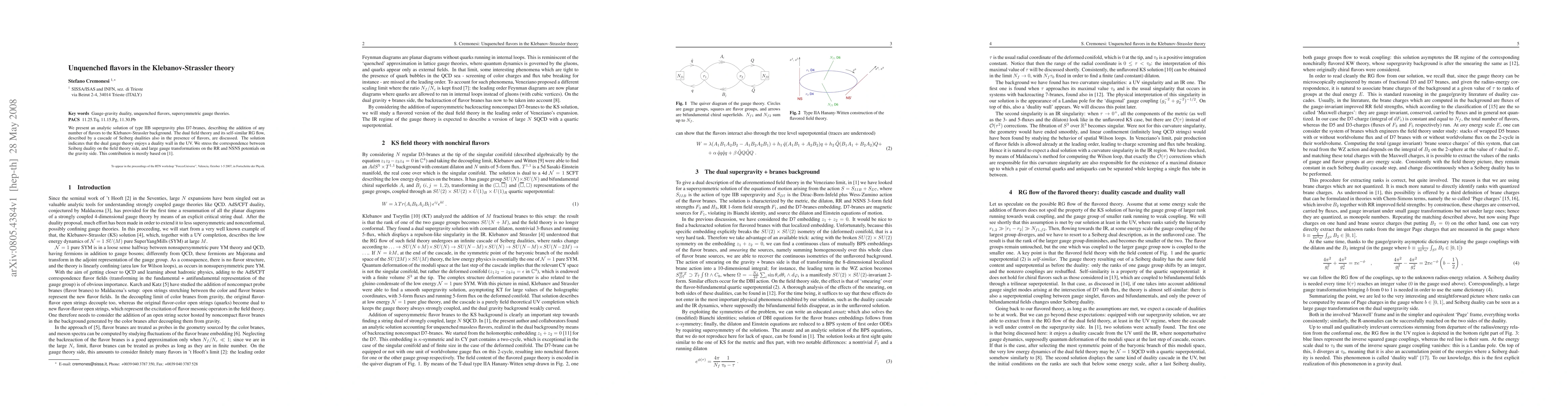 We present an analytic solution of type IIB supergravity plus D7-branes, describing the addition of any number of flavors to the Klebanov-Strassler background. The dual field theory and its self-similar RG flow, described by a cascade of Seiberg dualities also in the presence of flavors, are discussed. The solution indicates that the dual gauge theory enjoys a duality wall in the UV. We stress the correspondence between Seiberg duality on the field theory side, and large gauge transformations on the RR and NSNS potentials on the gravity side. This contribution is mostly based on arxiv:0706.1238.