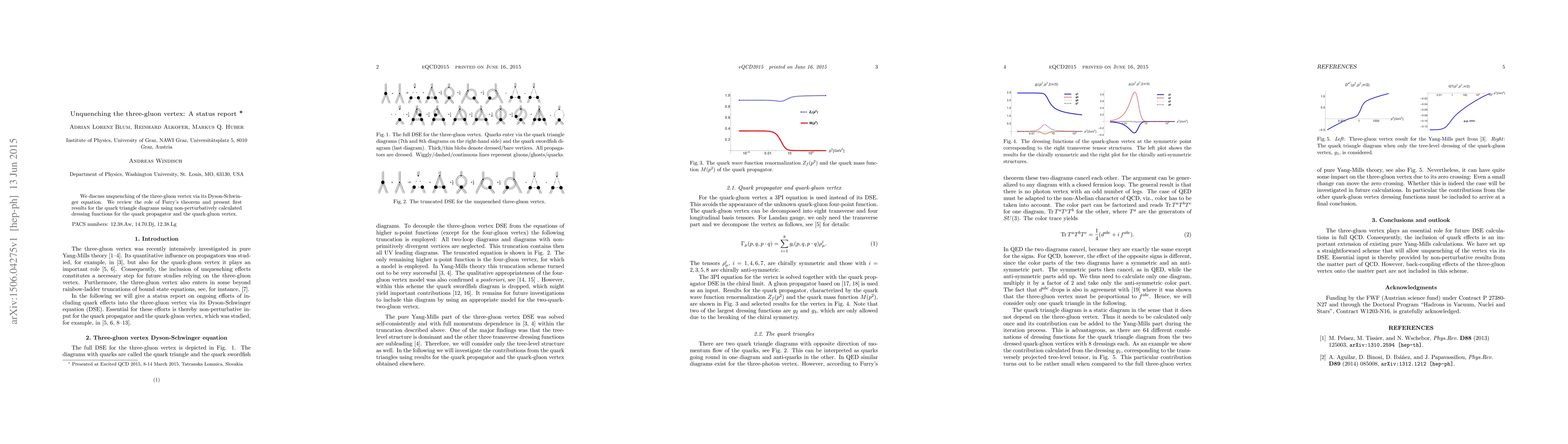 This paper reviews the unquenching of the three-gluon vertex through its Dyson-Schwinger equation, emphasizing the role of Furry's theorem and presenting initial findings on quark triangle diagrams with non-perturbatively computed dressing functions for the quark propagator and quark-gluon vertex.