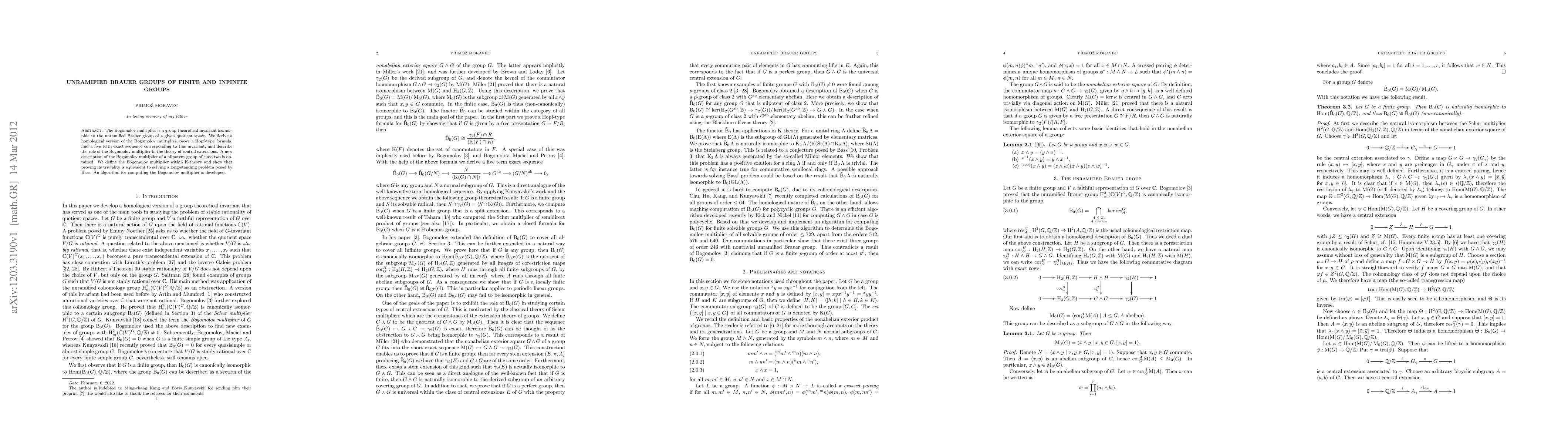 The Bogomolov multiplier is a group theoretical invariant isomorphic to the unramified Brauer group of a given quotient space. We derive a homological version of the Bogomolov multiplier, prove a Hopf-type formula, find a five term exact sequence corresponding to this invariant, and describe the role of the Bogomolov multiplier in the theory of central extensions. A new description of the Bogomolov multiplier of a nilpotent group of class two is obtained. We define the Bogomolov multiplier within K-theory and show that proving its triviality is equivalent to solving a long-standing problem posed by Bass. An algorithm for computing the Bogomolov multiplier is developed.