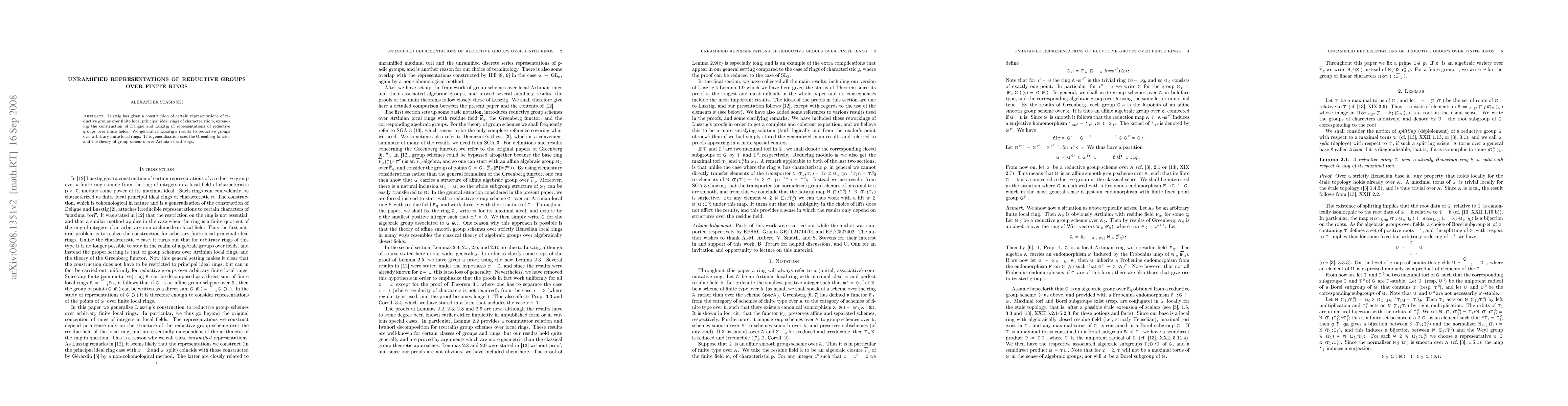 This paper generalizes Lusztig's construction of unramified representations for reductive groups over finite local principal ideal rings to arbitrary finite local rings, employing the Greenberg functor and group schemes theory. The results extend the framework developed by Deligne and Lusztig for finite fields.