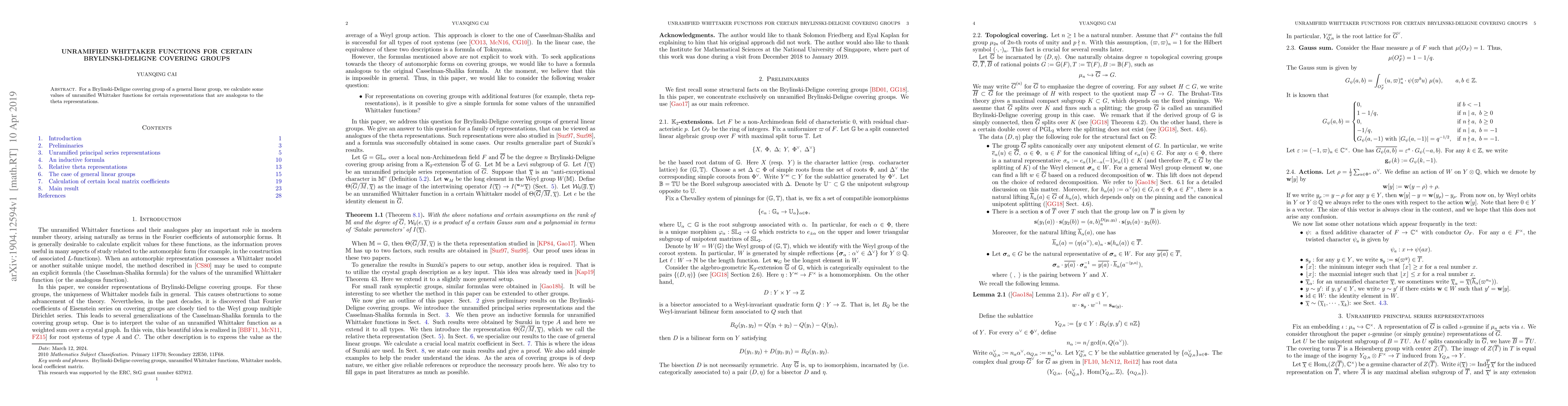 Researchers calculated unramified Whittaker functions for certain representations of Brylinski-Deligne covering groups, a generalization of theta representations.