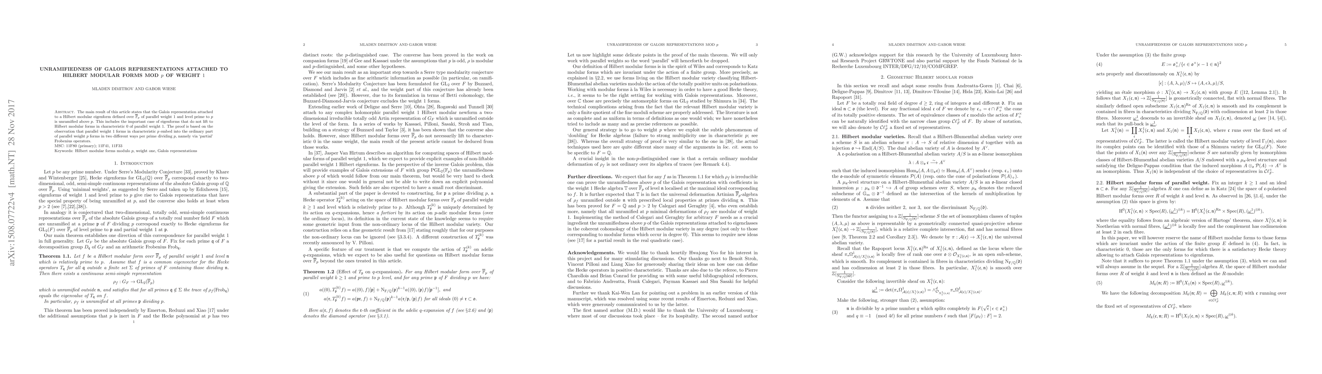 This paper proves that Galois representations associated with weight one Hilbert modular eigenforms, defined over an algebraic closure of a finite field of characteristic p, are unramified above p. The proof leverages embeddings of weight 1 forms into the ordinary part of weight p forms through partial Frobenius operators.