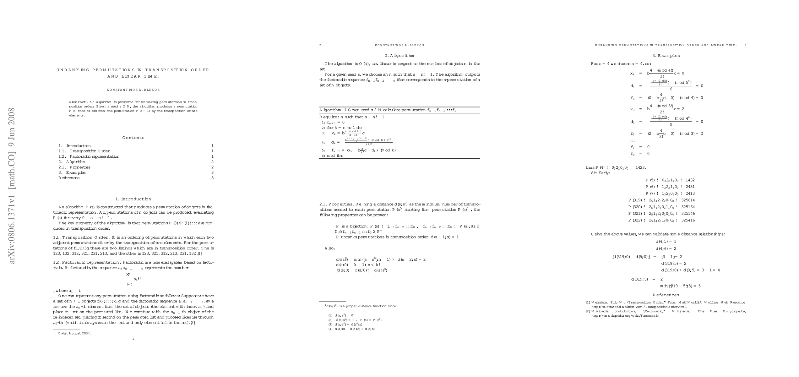 Summary: This paper introduces an efficient algorithm that unranks permutations in transposition order, generating a permutation P(s) differing from P(s+1) by a single element swap, all within linear time complexity.
