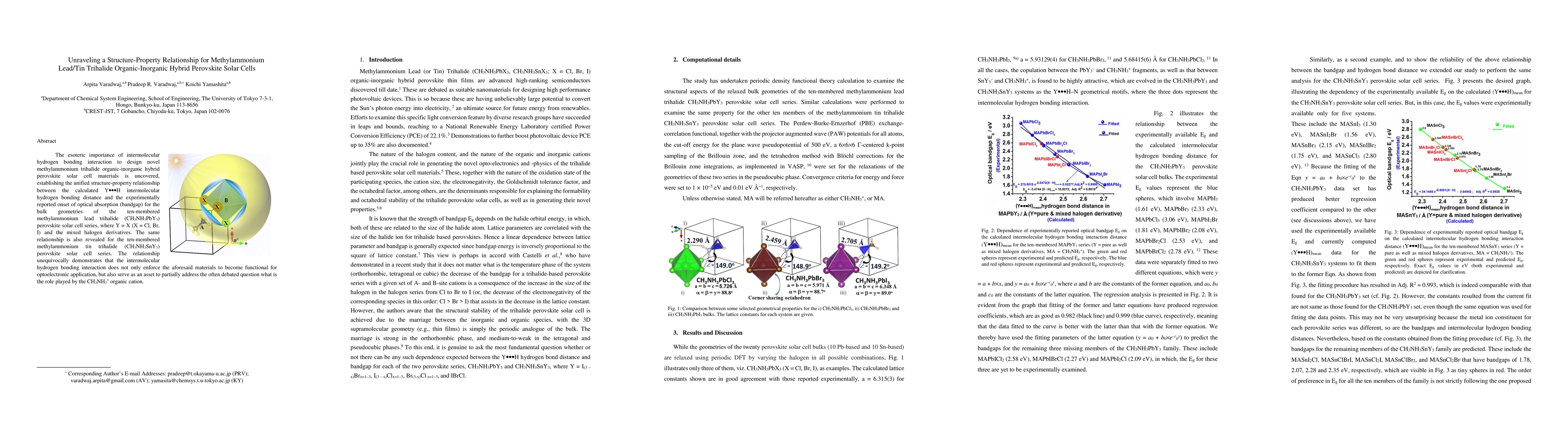 This paper explores the critical role of intermolecular hydrogen bonding in methylammonium lead/tin trihalide perovskite solar cells, establishing a clear structure-property relationship between the hydrogen bonding distance and the optical absorption onset. The findings reveal that hydrogen bonding not only enhances the material's functionality but also helps clarify the role of the methylammonium organic cation.