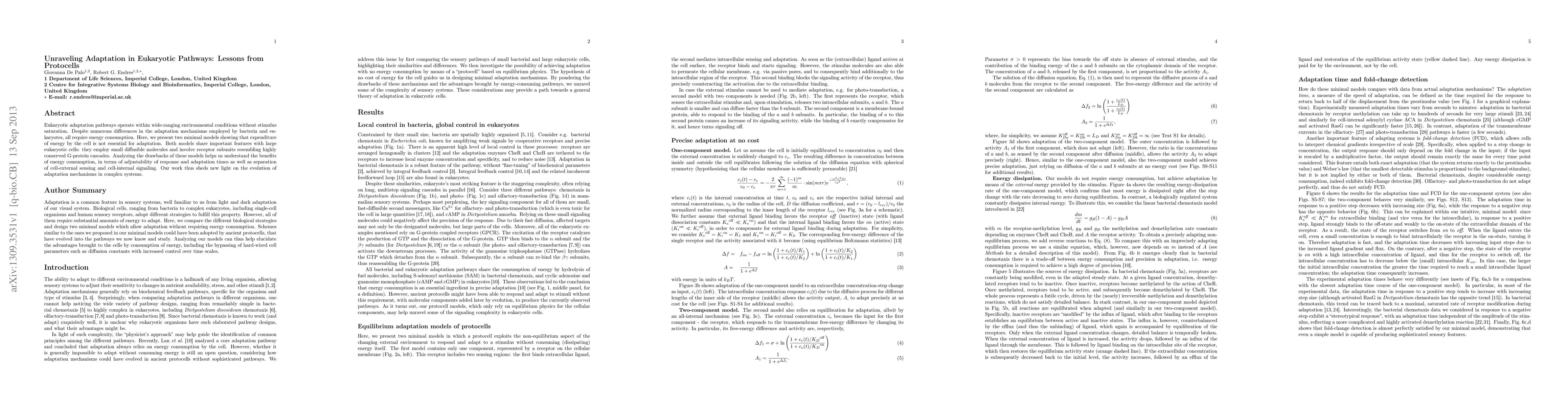 Eukaryotic adaptation pathways operate within wide-ranging environmental conditions without stimulus saturation. Despite numerous differences in the adaptation mechanisms employed by bacteria and eukaryotes, all require energy consumption. Here, we present two minimal models showing that expenditure of energy by the cell is not essential for adaptation. Both models share important features with large eukaryotic cells: they employ small diffusible molecules and involve receptor subunits resembling highly conserved G-protein cascades. Analyzing the drawbacks of these models helps us understand the benefits of energy consumption, in terms of adjustability of response and adaptation times as well as separation of cell-external sensing and cell-internal signaling. Our work thus sheds new light on the evolution of adaptation mechanisms in complex systems.