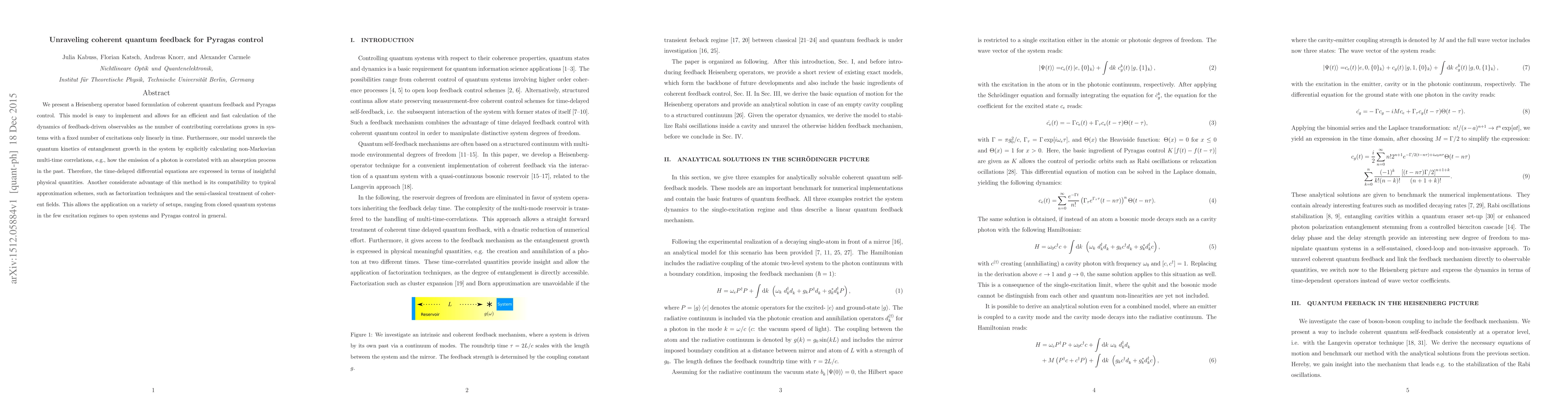 This paper introduces a Heisenberg operator-based model for coherent quantum feedback and Pyragas control, facilitating efficient calculations of dynamics in quantum systems. It also reveals the quantum kinetics of entanglement growth through non-Markovian multi-time correlations and is compatible with various approximation schemes, making it applicable to diverse quantum systems.