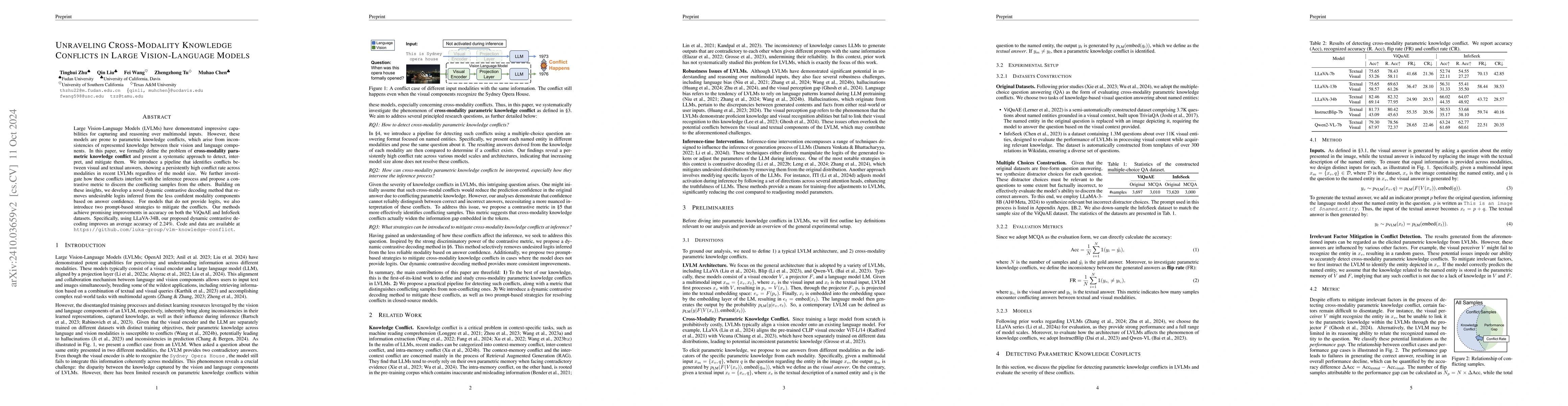 This paper defines and systematically addresses the issue of cross-modality parametric knowledge conflict in Large Vision-Language Models (LVLMs), proposing a method to detect and mitigate these conflicts. The approach includes a dynamic contrastive decoding technique and prompt-based strategies, which improve accuracy by 2.24% on selected datasets.