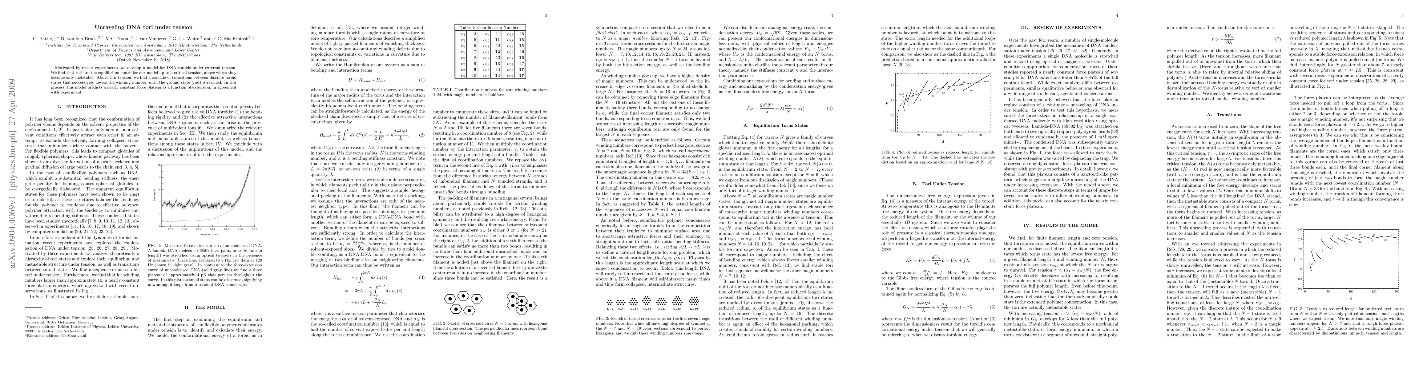 Researchers developed a model for DNA toroids under tension, finding that they transition between states with decreasing winding number until reaching the ground state (rod) at a critical tension beyond which they become metastable.