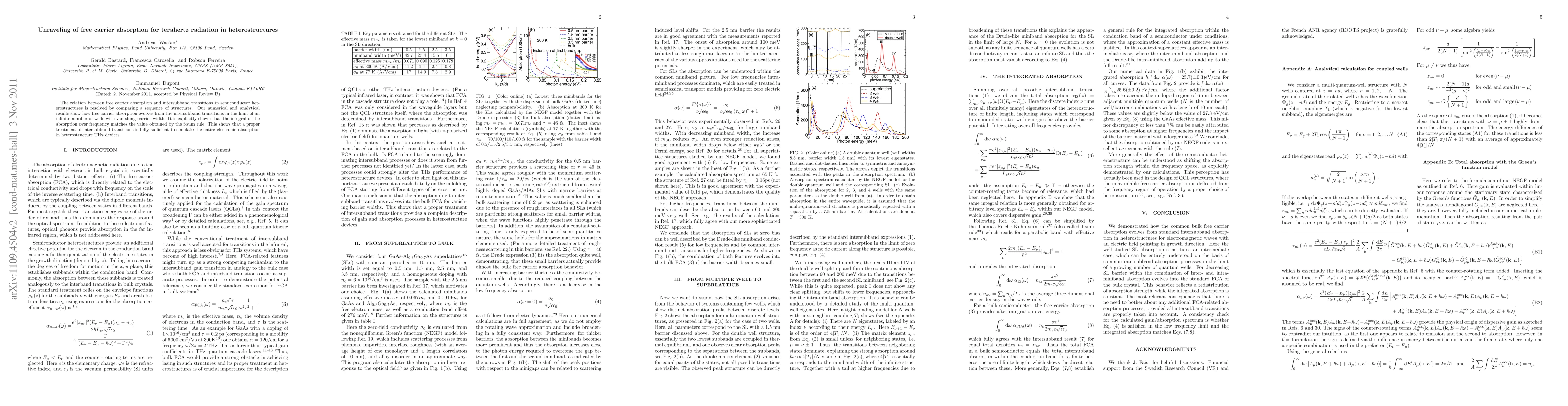 This paper investigates the relationship between free carrier absorption and intersubband transitions in semiconductor heterostructures, revealing how free carrier absorption emerges from intersubband transitions as barrier width diminishes. The study confirms that intersubband transitions adequately simulate electronic absorption in THz devices, aligning with the f-sum rule.