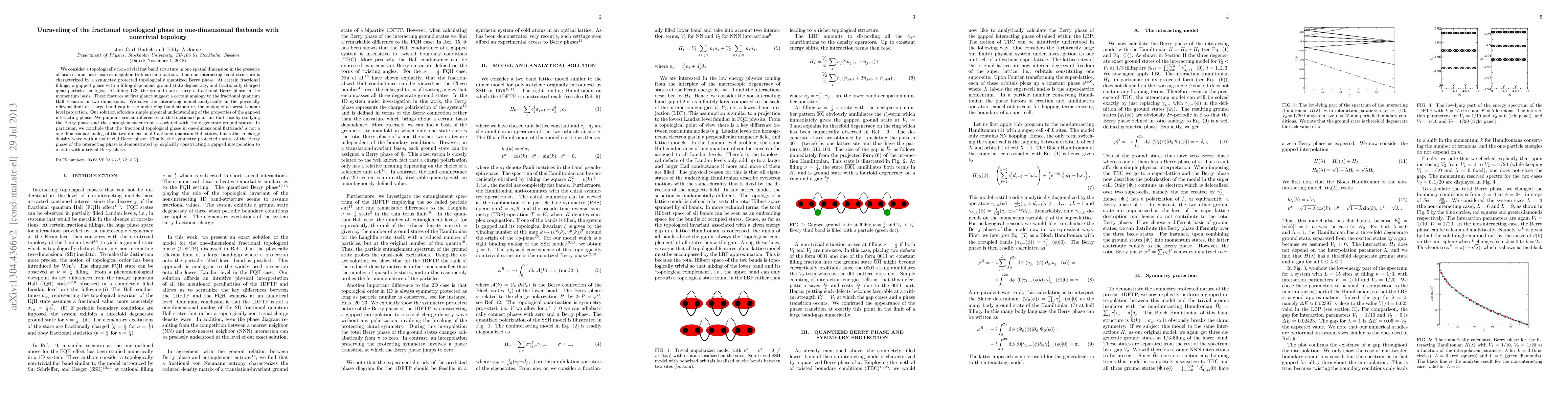 We consider a topologically non-trivial flat band structure in one spatial dimension in the presence of nearest and next nearest neighbor Hubbard interaction. The non-interacting band structure is characterized by a symmetry protected topologically quantized Berry phase. At certain fractional fillings, a gapped phase with a filling-dependent ground state degeneracy, and fractionally charged quasi-particles emerges. At filling 1/3, the ground states carry a fractional Berry phase in the momentum basis. These features at first glance suggest a certain analogy to the fractional quantum Hall scenario in two dimensions. We solve the interacting model analytically in the physically relevant limit of a large band gap in the underlying band structure, the analog of a lowest Landau level projection. Our solution affords a simple physical understanding of the properties of the gapped interacting phase. We pinpoint crucial differences to the fractional quantum Hall case by studying the Berry phase and the entanglement entropy associated with the degenerate ground states. In particular, we conclude that the `fractional topological phase in one-dimensional flatbands' is not a one-dimensional analog of the two-dimensional fractional quantum Hall states, but rather a charge density wave with a nontrivial Berry phase. Finally, the symmetry protected nature of the Berry phase of the interacting phase is demonstrated by explicitly constructing a gapped interpolation to a state with a trivial Berry phase.
