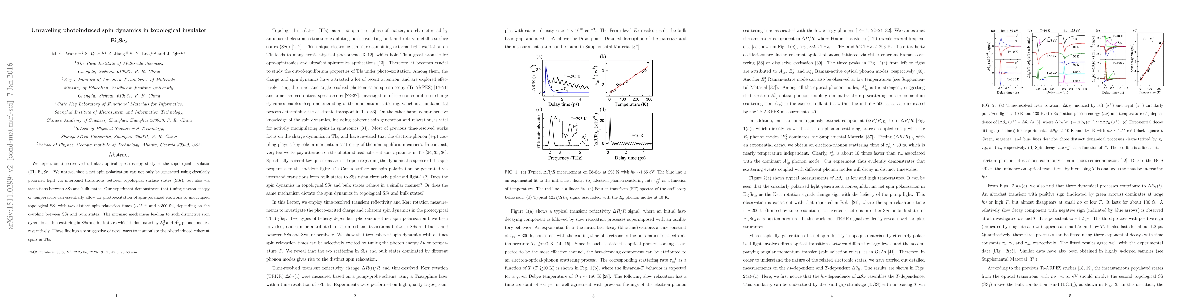 We report on time-resolved ultrafast optical spectroscopy study of the topological insulator (TI) Bi$_2$Se$_3$. We unravel that a net spin polarization can not only be generated using circularly polarized light via interband transitions between topological surface states (SSs), but also via transitions between SSs and bulk states. Our experiment demonstrates that tuning photon energy or temperature can essentially allow for photoexcitation of spin-polarized electrons to unoccupied topological SSs with two distinct spin relaxation times ($\sim$25 fs and $\sim$300 fs), depending on the coupling between SSs and bulk states. The intrinsic mechanism leading to such distinctive spin dynamics is the scattering in SSs and bulk states which is dominated by $E_g^2$ and $A_{1g}^1$ phonon modes, respectively. These findings are suggestive of novel ways to manipulate the photoinduced coherent spins in TIs.