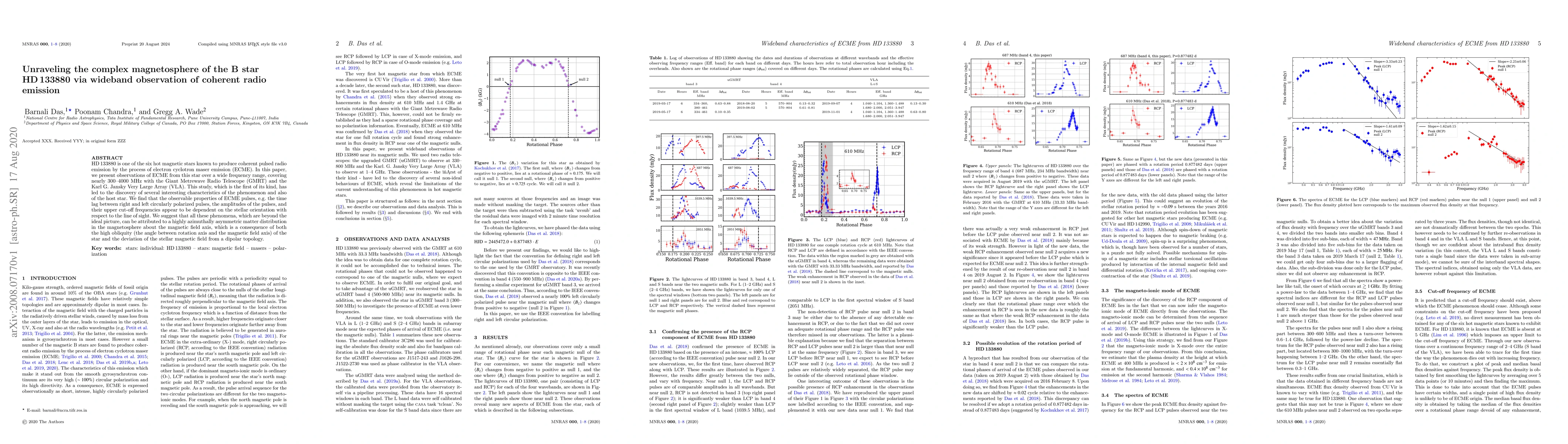 HD 133880 is one of the six hot magnetic stars known to produce coherent pulsed radio emission by the process of electron cyclotron maser emission (ECME). In this paper, we present observations of ECME from this star over a wide frequency range, covering nearly 300 - 4000 MHz with the Giant Metrewave Radio Telescope (GMRT) and the Karl G. Jansky Very Large Array (VLA). This study, which is the first of its kind, has led to the discovery of several interesting characteristics of the phenomenon and also of the host star. We find that the observable properties of ECME pulses, e.g. the time lag between right and left circularly polarized pulses, the amplitudes of the pulses, and their upper cut-off frequencies appear to be dependent on the stellar orientation with respect to the line of sight. We suggest that all these phenomena, which are beyond the ideal picture, can be attributed to a highly azimuthally asymmetric matter distribution in the magnetosphere about the magnetic field axis, which is a consequence of both the high obliquity (the angle between rotation axis and the magnetic field axis) of the star and the deviation of the stellar magnetic field from a dipolar topology.
