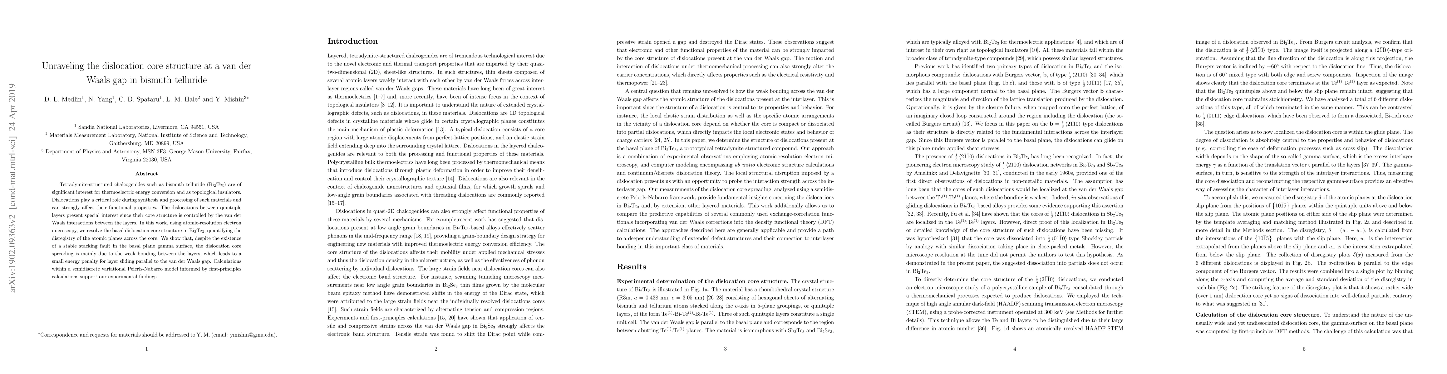 This study utilizes atomic-resolution electron microscopy to reveal the core structure of dislocations in bismuth telluride Bi_{2}Te_{3} at van der Waals gaps, showing that dislocation core spreading is primarily due to weak interlayer bonding. Computational models corroborate these findings, highlighting the influence of van der Waals interactions on dislocation behavior.