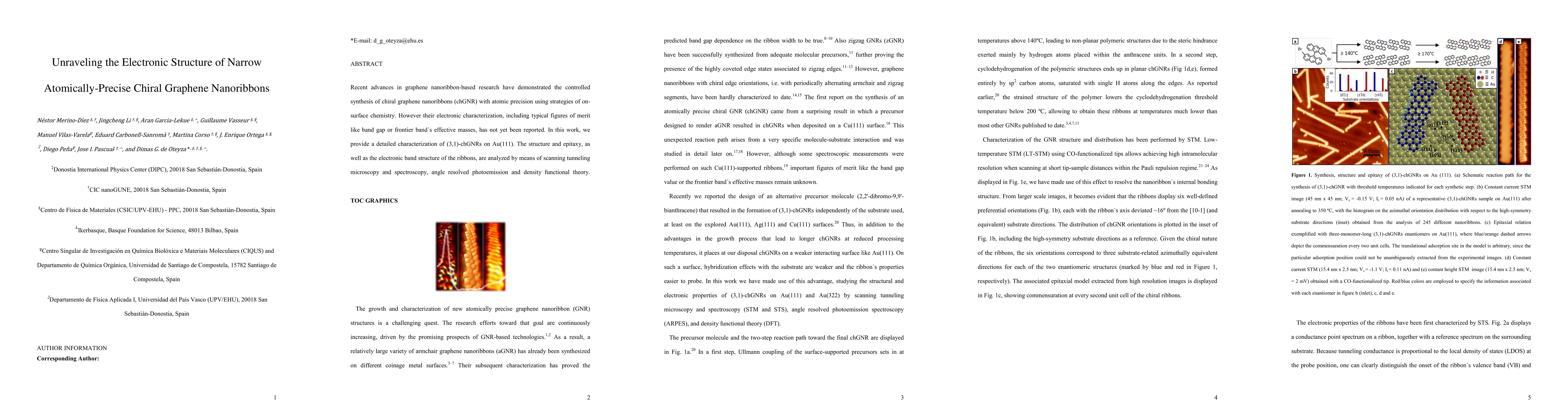 This paper investigates the electronic structure of atomically-precise chiral graphene nanoribbons (cGNR) using advanced techniques like scanning tunneling microscopy and spectroscopy, angle-resolved photoemission, and density functional theory. The study provides detailed insights into the electronic band structure and figures of merit such as band gap and effective masses for (3,1)-cGNRs on Au(111).
