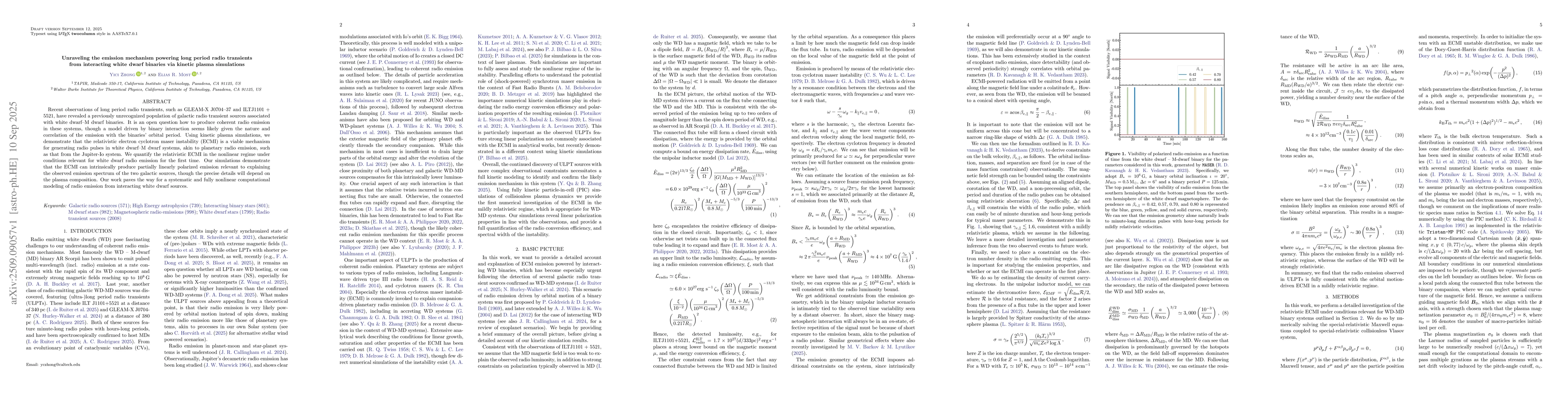 Recent observations of long period radio transients, such as GLEAM-X J0704-37 and ILTJ1101 + 5521, have revealed a previously unrecognized population of galactic radio transient sources associated with white dwarf - M dwarf binaries. It is an open question how to produce coherent radio emission in these systems, though a model driven by binary interaction seems likely given the nature and correlation of the emission with the binaries' orbital period. Using kinetic plasma simulations, we demonstrate that the relativistic electron cyclotron maser instability (ECMI) is a viable mechanism for generating radio pulses in white dwarf - M dwarf systems, akin to planetary radio emission, such as that from the Jupiter-Io system. We quantify the relativistic ECMI in the nonlinear regime under conditions relevant for white dwarf radio emission for the first time. Our simulations demonstrate that the ECMI can intrinsically produce partially linearly polarized emission relevant to explaining the observed emission spectrum of the two galactic sources, though the precise details will depend on the plasma composition. Our work paves the way for a systematic and fully nonlinear computational modeling of radio emission from interacting white dwarf sources.