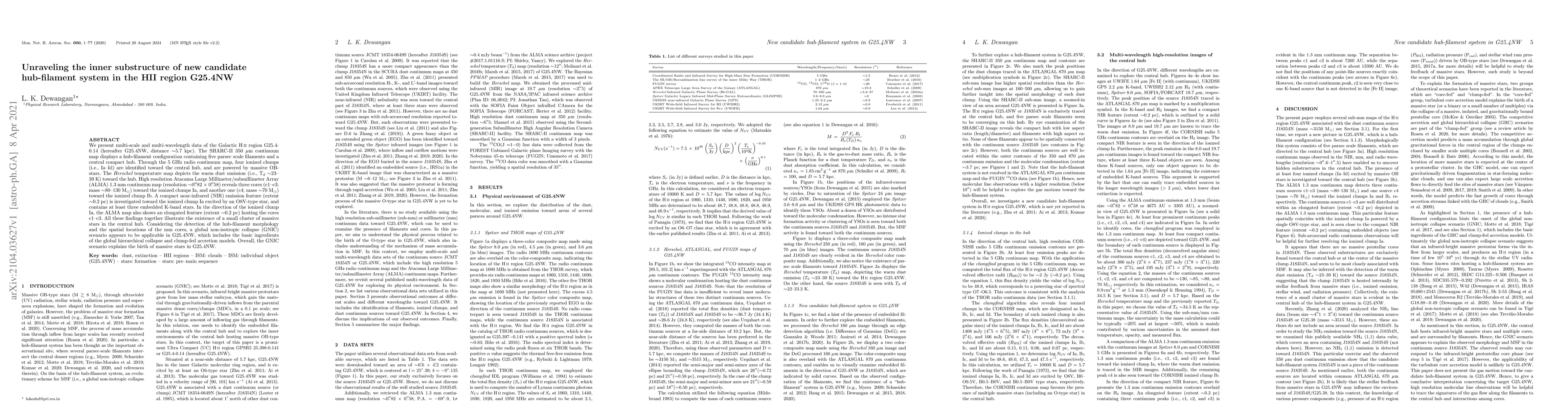 This study reveals a hub-filament system in the HII region G25.4NW, featuring a central hub with ionized clumps powered by OB stars and warm dust emission. ALMA observations identify multiple massive cores, suggesting the formation of a cluster of massive stars, consistent with a global non-isotropic collapse scenario.