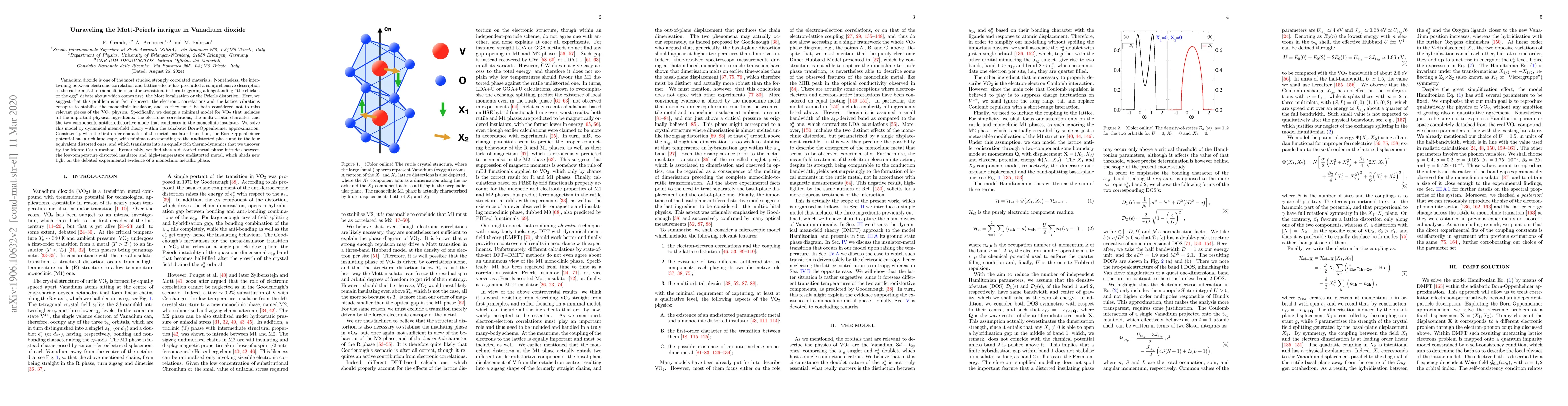 This paper proposes a minimal model for vanadium dioxide that integrates electronic correlations and lattice vibrations to explain its metal-insulator transition, revealing a distorted metal phase between the monoclinic insulator and undistorted metal, thus resolving the longstanding debate about the sequence of Mott localization and Peierls distortion.