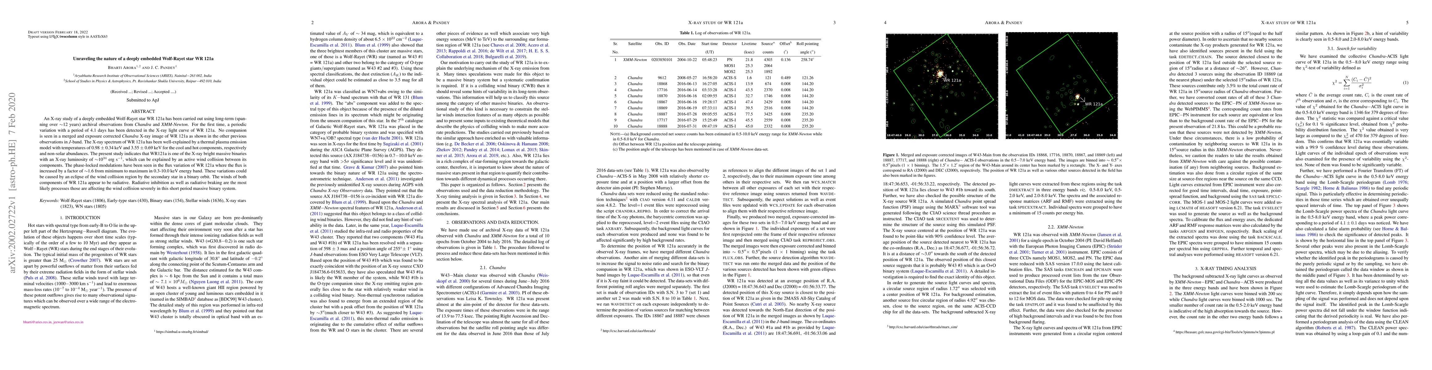 An X-ray study of a deeply embedded Wolf-Rayet star WR 121a has been carried out using long-term (spanning over ~12 years) archival observations from Chandra and XMM-Newton. For the first time, a periodic variation with a period of 4.1 days has been detected in the X-ray light curve of WR 121a. No companion is seen in a merged and exposure corrected Chandra X-ray image of WR 121a as shown in the other previous observations in J-band. The X-ray spectrum of WR 121a has been well-explained by a thermal plasma emission model with temperatures of 0.98+/-0.34 keV and 3.55+/-0.69 keV for the cool and hot components, respectively and non-solar abundances. The present study indicates that WR121a is one of the X-ray bright massive binaries with an X-ray luminosity of ~10^34 erg/s, which can be explained by an active wind collision between its components. The phase-locked modulations have been seen in the flux variation of WR 121a where the flux is increased by a factor of ~1.6 from minimum to maximum in 0.3-10.0 keV energy band. These variations could be caused by an eclipse of the wind collision region by the secondary star in a binary orbit. The winds of both components of WR 121a appear to be radiative. Radiative inhibition as well as radiative braking are the most likely processes those are affecting the wind collision severely in this short period massive binary system.