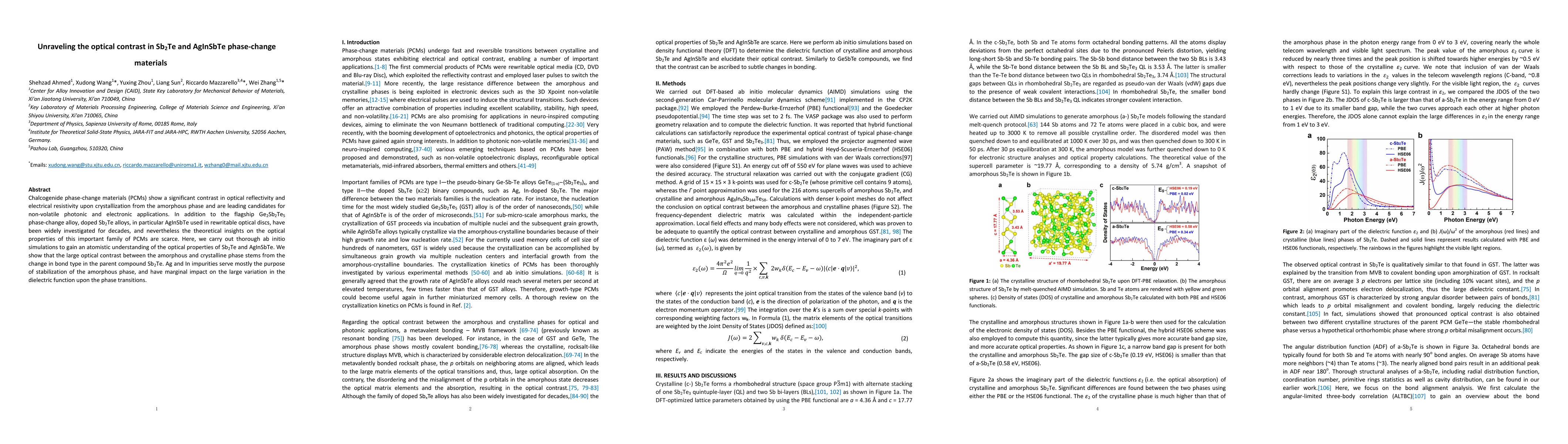 Thorough DFT and AIMD simulations to investigate the optical contrast between amorphous and crystalline Sb2Te and AIST, elucidating the role of bond alignment, angular disorder, and impurity effects.