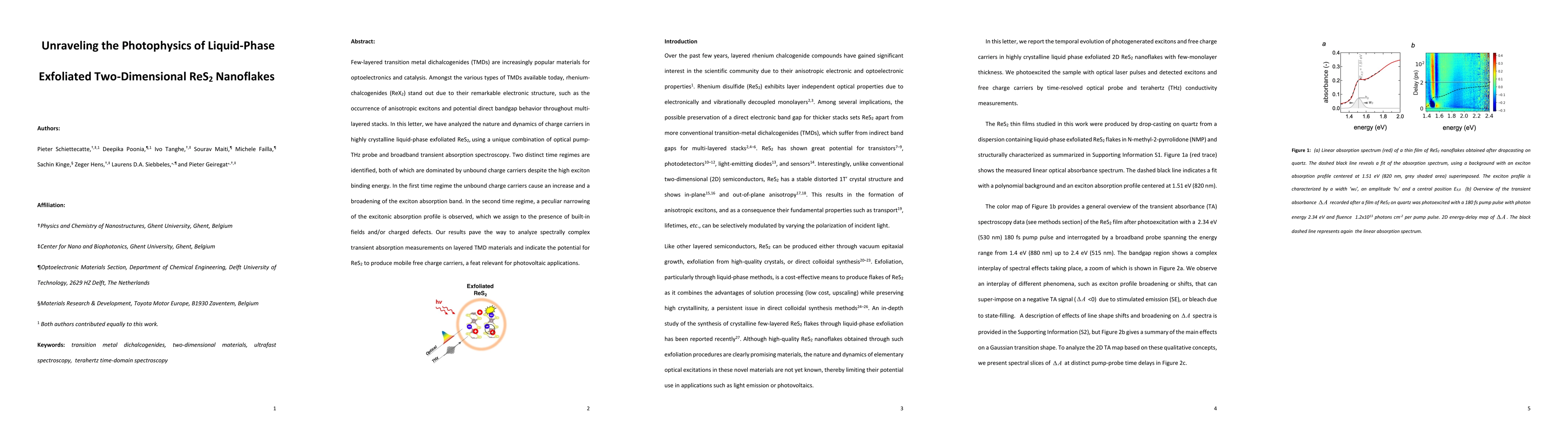 This research analyzes the behavior of charge carriers in liquid-phase exfoliated ReS2 nanoflakes using optical pump-THz probe and broadband transient absorption spectroscopy. Two distinct time regimes are identified, showing unbound charge carriers causing changes in exciton absorption. The findings suggest potential for ReS2 in photovoltaic applications.